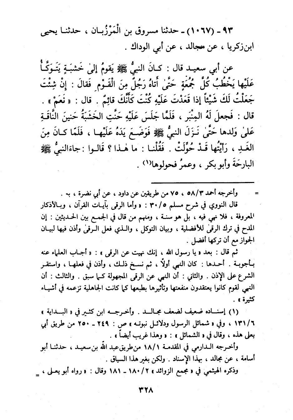 1067 - حَدَّثَنَا مَسْرُوقُ بْنُ الْمَرْزُبَانِ، حَدَّثَنَا يَحْيَى بْنُ زَكَرِيَّا، عَنْ مُجَالِدٍ، عَنْ أَبِي الْوَدَّاكِ، عَنْ أَبِي سَعِيدٍ قَالَ: كَانَ النَّبِيُّ صَلَّى اللهُ عَلَيْهِ وَسَلَّمَ يَقُومُ إِلَى خَشَبَةٍ يَتَوَكَّأُ عَلَيْهَا، يَخْطُبُ كُلَّ جُمُعَةٍ حَتَّى أَتَاهُ رَجُلٌ مِنَ الْقَوْمِ فَقَالَ: إِنْ شِئْتَ جَعَلْتُ لَكَ شَيْئًا إِذَا قَعَدْتَ عَلَيْهِ كُنْتَ كَأَنَّكَ قَائِمٌ؟ قَالَ: «نَعَمْ»، قَالَ: فَجَعَلَ لَهُ الْمِنْبَرَ، §فَلَمَّا جَلَسَ عَلَيْهِ حَنَّتِ الْخَشَبَةُ حَنِينَ النَّاقَةِ عَلَى وَلَدِهَا، حَتَّى نَزَّلَ النَّبِيُّ صَلَّى اللهُ عَلَيْهِ وَسَلَّمَ فَوَضَعَ يَدَهُ عَلَيْهَا، فَلَمَّا كَانَ مِنَ الْغَدِ، رَأَيْتُهَا قَدْ حُوِّلَتْ، فَقُلْنَا: مَا هَذَا؟ قَالُوا: جَاءَ النَّبِيُّ صَلَّى اللهُ عَلَيْهِ وَسَلَّمَ الْبَارِحَةَ وَأَبُو بَكْرٍ وَعُمَرُ فَحَوَّلُوهَاKإسناده ضعيف