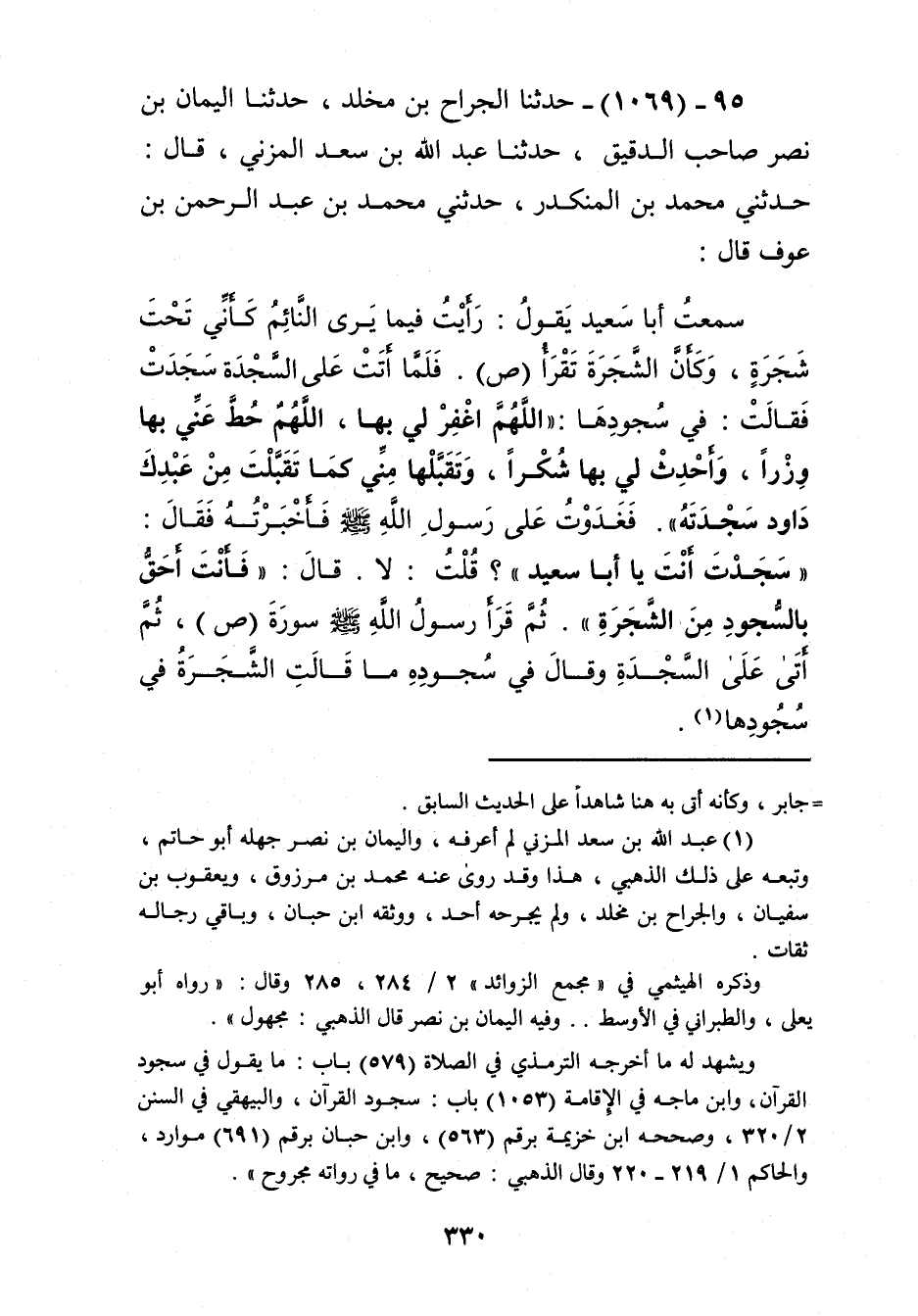 1069 - حَدَّثَنَا الْجَرَّاحُ بْنُ مَخْلَدٍ، حَدَّثَنَا الْيَمَانُ بْنُ نَصْرٍ - صَاحِبُ الدَّقِيقِ - حَدَّثَنَا عَبْدُ اللَّهِ بْنُ سَعْدٍ الْمُزَنِيُّ قَالَ: حَدَّثَنِي مُحَمَّدُ بْنُ الْمُنْكَدِرِ، حَدَّثَنِي مُحَمَّدُ بْنُ عَبْدِ الرَّحْمَنِ بْنِ عَوْفٍ قَالَ: سَمِعْتُ أَبَا سَعِيدٍ يَقُولُ: رَأَيْتُ فِيمَا يَرَى النَّائِمُ كَأَنِّي تَحْتَ شَجَرَةٍ، وَكَأَنَّ الشَّجَرَةَ تَقْرَأُ ص، فَلَمَّا أَتَتْ عَلَى السَّجْدَةِ سَجَدَتْ، فَقَالَتْ فِي سُجُودِهَا: §اللَّهُمَّ اغْفِرْ لِي بِهَا، اللَّهُمَّ حُطَّ عَنِّي بِهَا وِزْرًا، وَأَحْدِثْ لِي بِهَا شُكْرًا، وَتَقَبَّلْهَا مِنِّي كَمَا تَقَبِّلْتَ مِنْ عَبْدِكَ دَاوُدَ سَجْدَتَهُ، فَغَدَوْتُ عَلَى رَسُولِ اللَّهِ صَلَّى اللهُ عَلَيْهِ وَسَلَّمَ فَأَخْبَرْتُهُ فَقَالَ: «سَجَدْتَ أَنْتَ يَا أَبَا سَعِيدٍ؟»، قُلْتُ: لَا، قَالَ: «فَأَنْتَ أَحَقُّ بِالسُّجُودِ مِنَ الشَّجَرَةِ»، ثُمَّ قَرَأَ رَسُولُ اللَّهِ صَلَّى اللهُ عَلَيْهِ وَسَلَّمَ سُورَةَ ص ثُمَّ أَتَى عَلَى السَّجْدَةِ وَقَالَ فِي سُجُودِهِ مَا قَالَتِ الشَّجَرَةُ فِي سُجُودِهَاKعبد الله بن سعد المزني وثقه ابن حبان وباقي رجاله ثقات