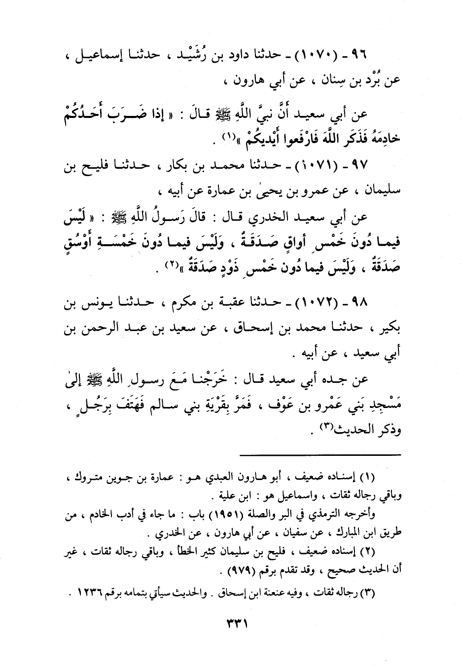 1071 - حَدَّثَنَا مُحَمَّدُ بْنُ بَكَّارٍ، حَدَّثَنَا فُلَيْحُ بْنُ سُلَيْمَانَ، عَنْ عَمْرِو بْنِ يَحْيَى بْنِ عُمَارَةَ، عَنْ أَبِيهِ، عَنْ أَبِي سَعِيدٍ الْخُدْرِيِّ قَالَ: قَالَ رَسُولُ اللَّهِ صَلَّى اللهُ عَلَيْهِ وَسَلَّمَ: «§لَيْسَ فِيمَا دُونَ خَمْسِ أَوَاقٍ صَدَقَةٌ، وَلَيْسَ فِيمَا دُونَ خَمْسَةِ أَوْسُقٍ صَدَقَةٌ، وَلَيْسَ فِيمَا دُونَ خَمْسِ ذَوْدٍ صَدَقَةٌ» Kإسناده ضعيف