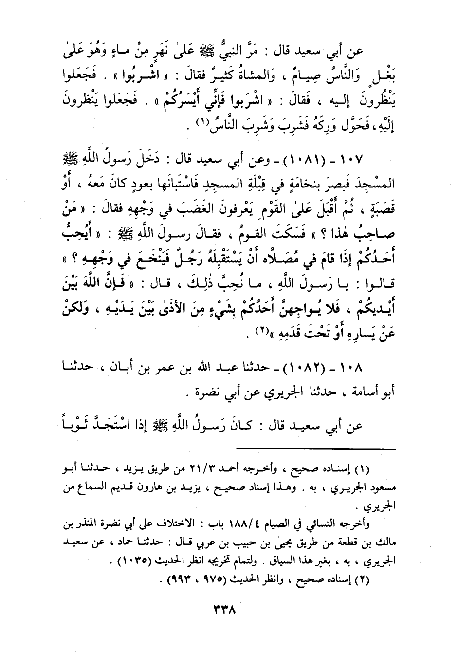 1081 - وَعَنْ أَبِي سَعِيدٍ قَالَ: دَخَلَ رَسُولُ اللَّهِ صَلَّى اللهُ عَلَيْهِ وَسَلَّمَ الْمَسْجِدَ فَبَصُرَ بِنُخَامَةٍ فِي قِبْلَةِ الْمَسْجِدِ فَاسْتَبَانَهَا بِعُودٍ كَانَ مَعَهُ، أَوْ قَصَبَةٍ، ثُمَّ أَقْبَلَ عَلَى الْقَوْمِ يَعْرِفُونَ الْغَضَبَ فِي وَجْهِهِ فَقَالَ: «مَنْ صَاحِبُ هَذَا؟»، فَسَكَتَ الْقَوْمُ، فَقَالَ رَسُولُ اللَّهِ صَلَّى اللهُ عَلَيْهِ وَسَلَّمَ: «§أَيُحِبُّ أَحَدُكُمْ إِذَا قَامَ فِي مُصَلَّاهُ أَنْ يَسْتَقْبِلَهُ رَجُلٌ فَيَنْخَعَ فِي وَجْهِهِ؟» قَالُوا: يَا رَسُولَ اللَّهِ، مَا نُحِبُّ ذَلِكَ، قَالَ: «فَإِنَّ اللَّهَ بَيْنَ أَيْدِيكُمْ، فَلَا يُوَاجِهَنَّ أَحَدُكُمْ بِشَيْءٍ مِنَ الْأَذَى بَيْنَ يَدَيْهِ، وَلَكِنْ عَنْ يَسَارِهِ أَوْ تَحْتَ قَدَمِهِ» Kإسناده صحيح