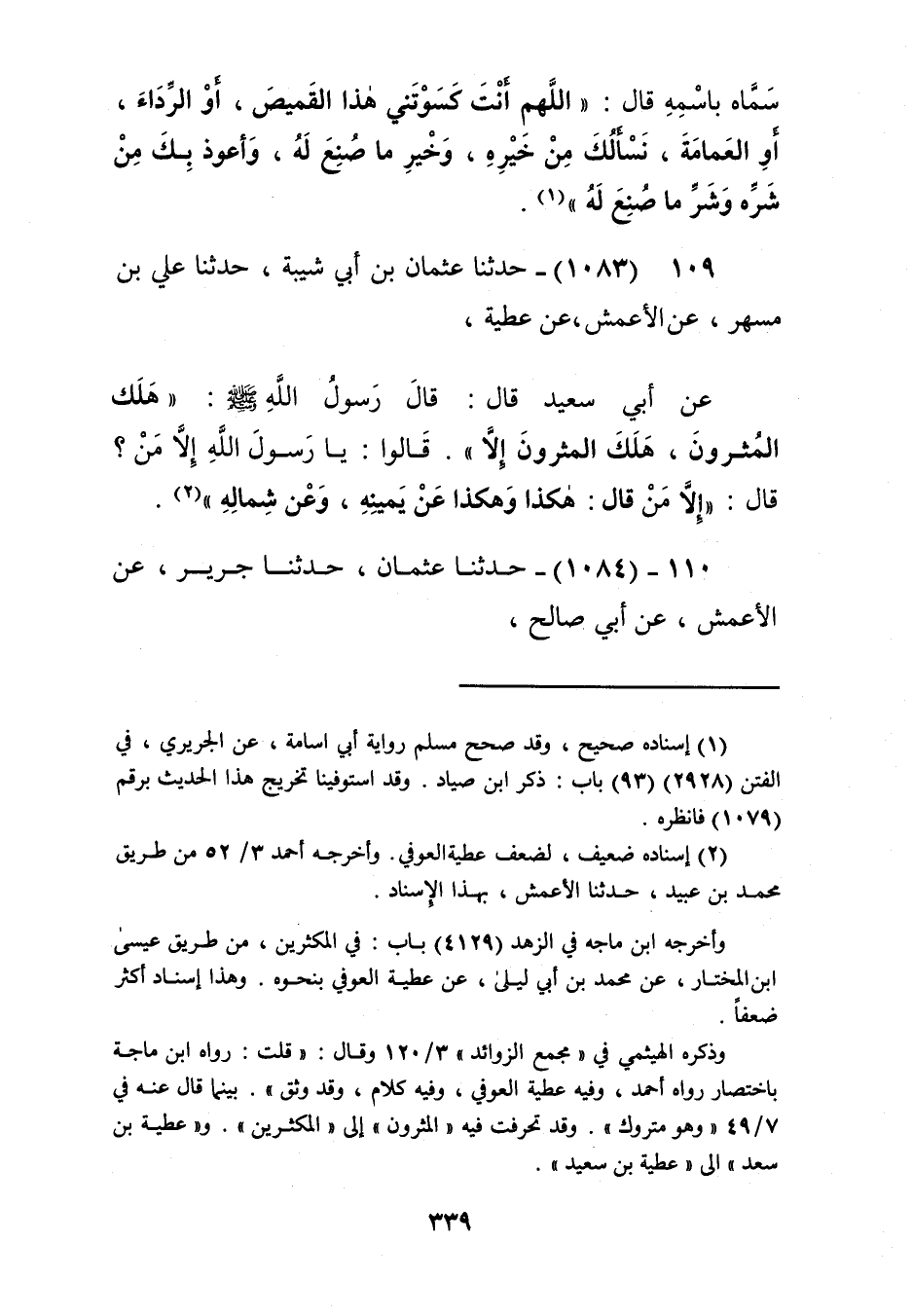 1083 - حَدَّثَنَا عُثْمَانُ بْنُ أَبِي شَيْبَةَ، حَدَّثَنَا عَلِيُّ بْنُ مُسْهِرٍ، عَنِ الْأَعْمَشِ، عَنْ عَطِيَّةَ، عَنْ أَبِي سَعِيدٍ قَالَ: قَالَ رَسُولُ اللَّهِ صَلَّى اللهُ عَلَيْهِ وَسَلَّمَ: «§هَلَكَ الْمُثْرُونَ، هَلَكَ الْمُثْرُونَ إِلَّا»، قَالُوا: يَا رَسُولَ اللَّهِ، إِلَّا مَنْ؟ قَالَ: " إِلَّا مَنْ قَالَ: هَكَذَا وَهَكَذَا عَنْ يَمِينِهِ، وَعَنْ شِمَالِهِ "Kإسناده ضعيف