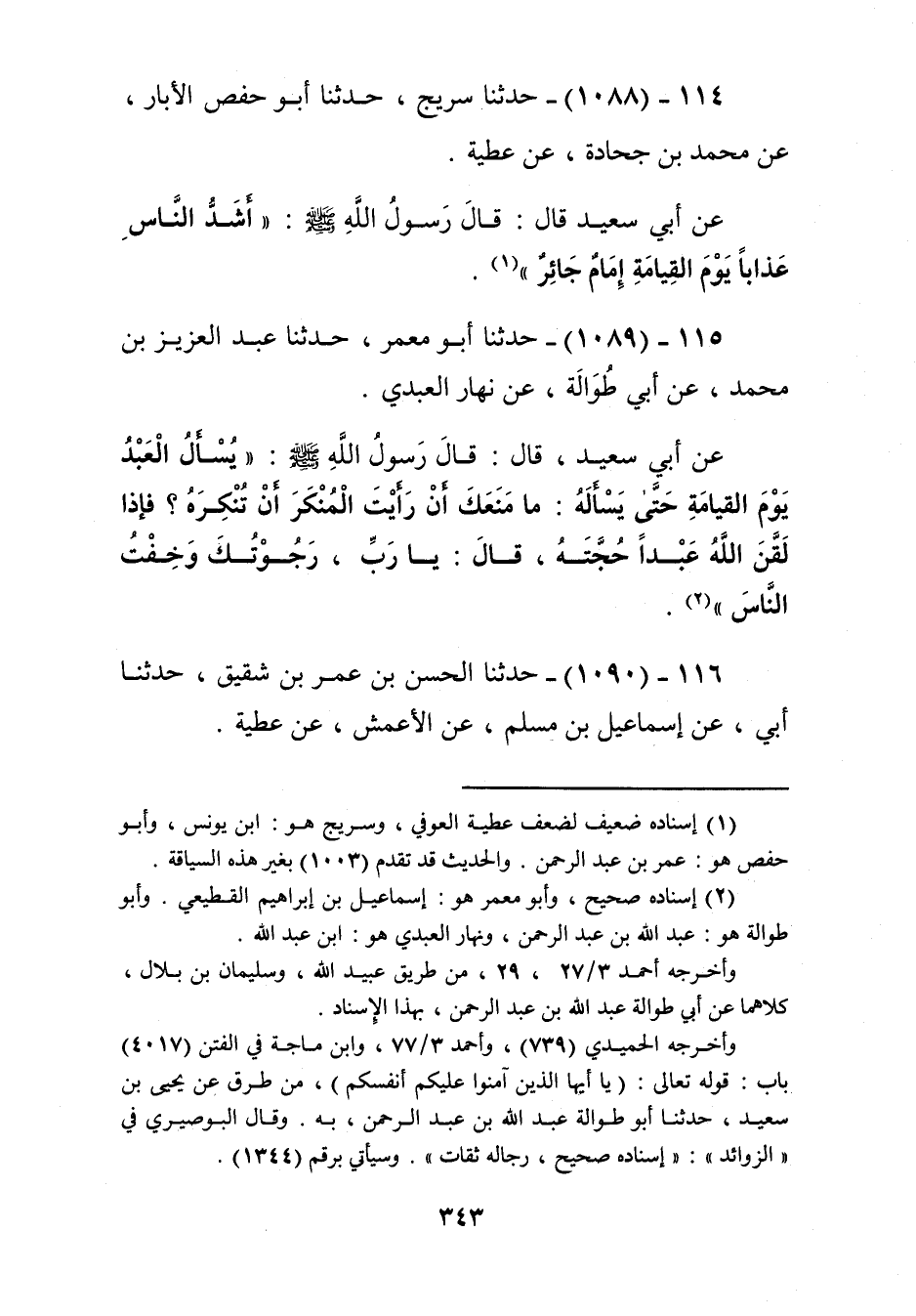 1088 - حَدَّثَنَا سُرَيْجٌ، حَدَّثَنَا أَبُو حَفْصٍ الْأَبَّارُ، عَنْ مُحَمَّدِ بْنِ جُحَادَةَ، عَنْ عَطِيَّةَ، عَنْ أَبِي سَعِيدٍ قَالَ: قَالَ رَسُولُ اللَّهِ صَلَّى اللهُ عَلَيْهِ وَسَلَّمَ: «§أَشَدُّ النَّاسِ عَذَابًا يَوْمَ الْقِيَامَةِ إِمَامٌ جَائِرٌ» Kإسناده ضعيف