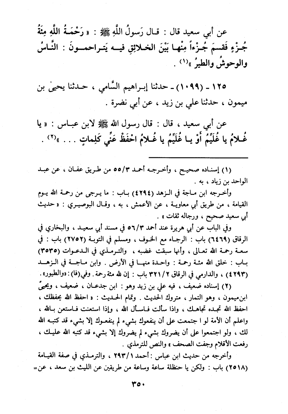 1099 - حَدَّثَنَا إِبْرَاهِيمُ السَّامِيُّ، حَدَّثَنَا يَحْيَى بْنُ مَيْمُونٍ، حَدَّثَنَا عَلِيُّ بْنُ زَيْدٍ، عَنْ أَبِي نَضْرَةَ، عَنْ أَبِي سَعِيدٍ قَالَ: قَالَ رَسُولُ اللَّهِ صَلَّى اللهُ عَلَيْهِ وَسَلَّمَ لِابْنِ عَبَّاسٍ: «§يَا غُلَامُ يَا غُلَيِّمُ، - أَوْ يَا غُلَيِّمُ يَا غُلَامُ - احْفَظْ عَنِّي كَلِمَاتٍ» -[351]- فَذَكَرَ الْحَدِيثَ فِي الْمُعْجَمِKإسناده ضعيف