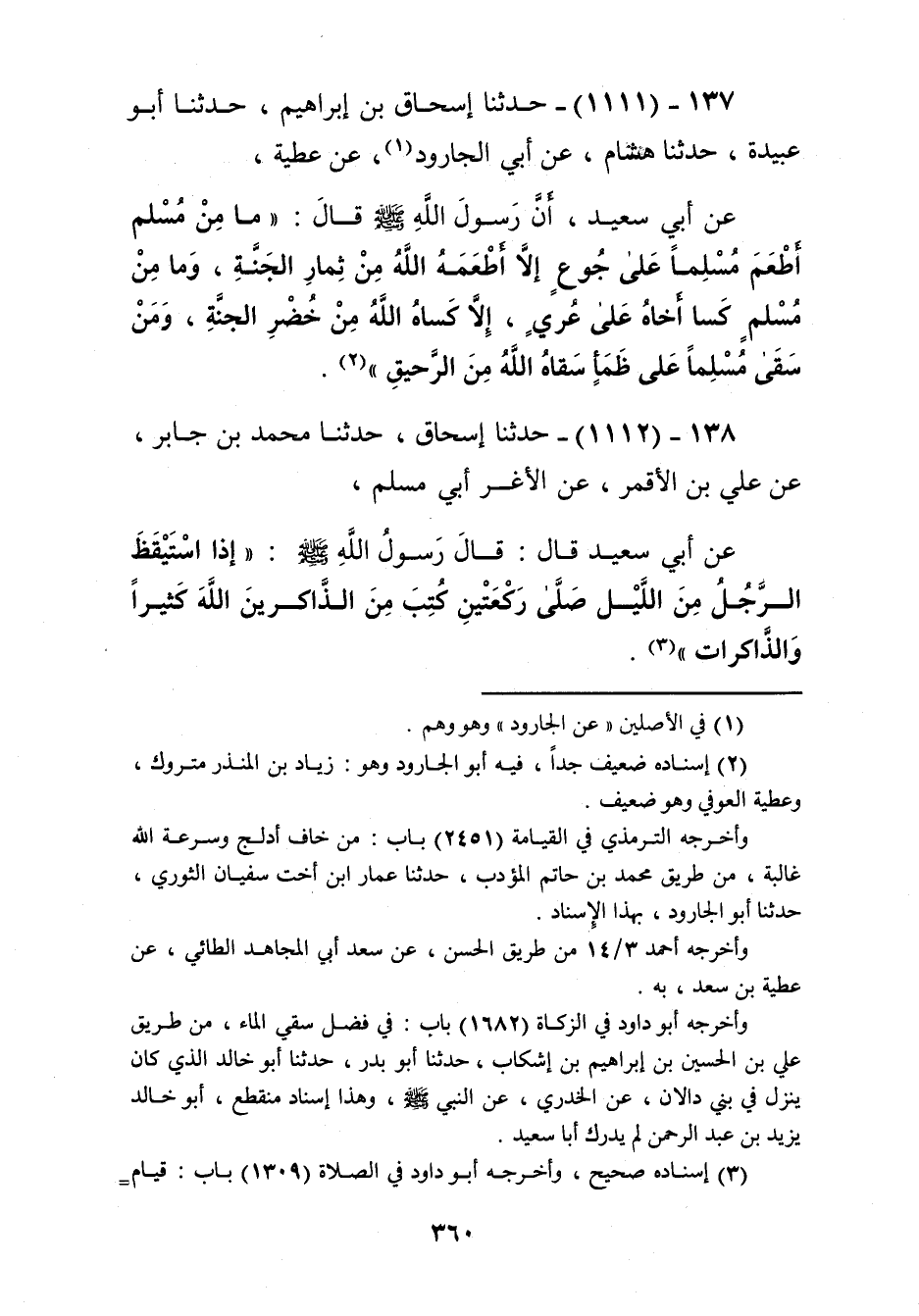1111 - حَدَّثَنَا إِسْحَاقُ بْنُ إِبْرَاهِيمَ، حَدَّثَنَا أَبُو عُبَيْدَةَ، حَدَّثَنَا هِشَامٌ، عَنْ أَبِي الْجَارُودِ، عَنْ عَطِيَّةَ، عَنْ أَبِي سَعِيدٍ، أَنَّ رَسُولَ اللَّهِ صَلَّى اللهُ عَلَيْهِ وَسَلَّمَ قَالَ: «§مَا مِنْ مُسْلِمٍ أَطْعَمَ مُسْلِمًا عَلَى جُوعٍ إِلَّا أَطْعَمَهُ اللَّهُ مِنْ ثِمَارِ الْجَنَّةِ، وَمَا مِنْ مُسْلِمٍ كَسَا أَخَاهُ عَلَى عُرْيٍ إِلَّا كَسَاهُ اللَّهُ مِنْ خُضْرِ الْجَنَّةِ، وَمَنْ سَقَى مُسْلِمًا عَلَى ظَمَأٍ سَقَاهُ اللَّهُ مِنَ الرَّحِيقِ» Kإسناده ضعيف جدا