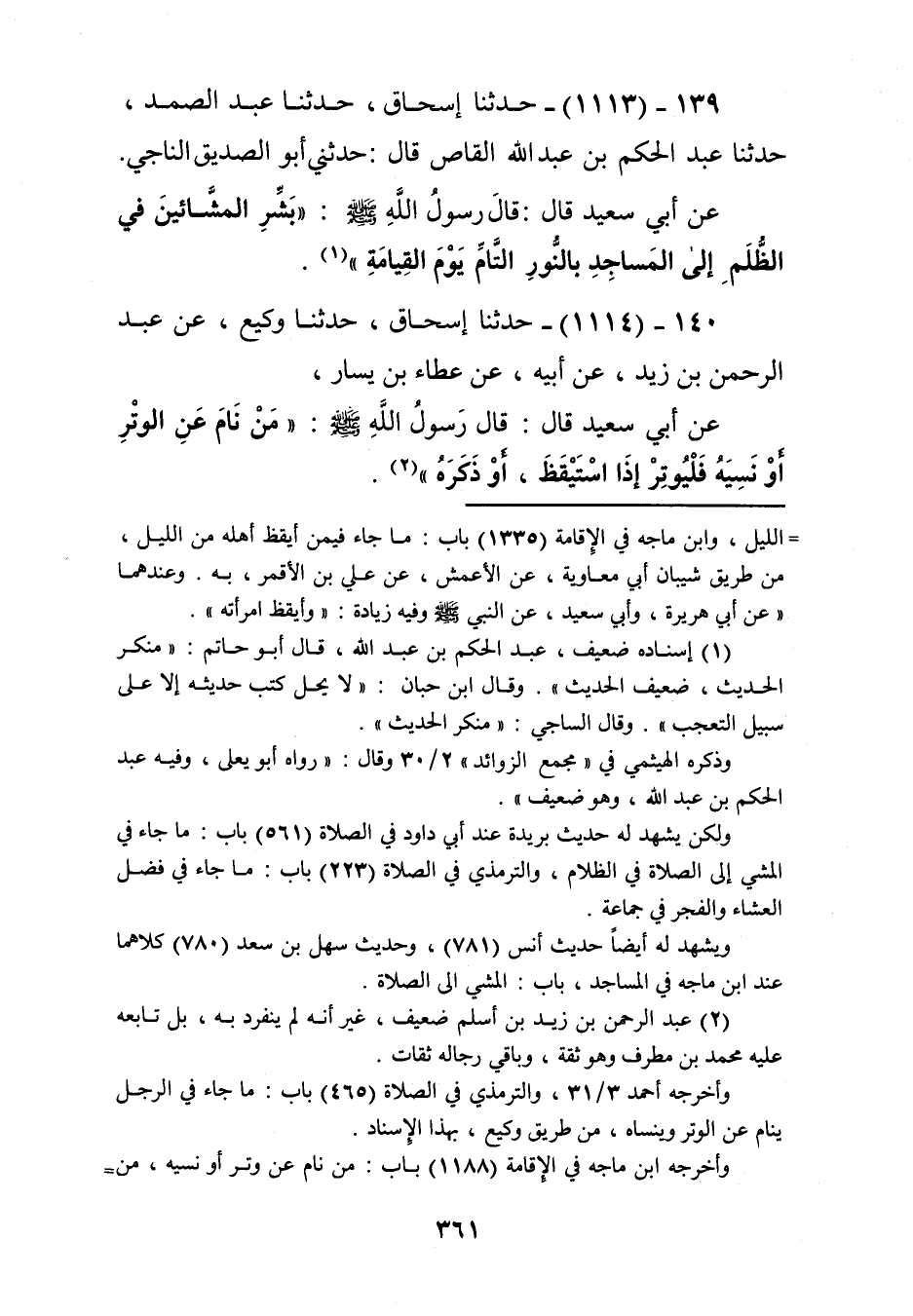1113 - حَدَّثَنَا إِسْحَاقُ، حَدَّثَنَا عَبْدُ الصَّمَدِ، حَدَّثَنَا عَبْدُ الْحَكَمِ بْنُ عَبْدِ اللَّهِ الْقَاصُّ قَالَ: حَدَّثَنِي أَبُو الصِّدِّيقُ النَّاجِي، عَنْ أَبِي سَعِيدٍ قَالَ: قَالَ رَسُولُ اللَّهِ صَلَّى اللهُ عَلَيْهِ وَسَلَّمَ: «§بَشِّرِ الْمَشَّائِينَ فِي الظُّلَمِ إِلَى الْمَسَاجِدِ بِالنُّورِ التَّامِّ يَوْمَ الْقِيَامَةِ» Kإسناده ضعيف