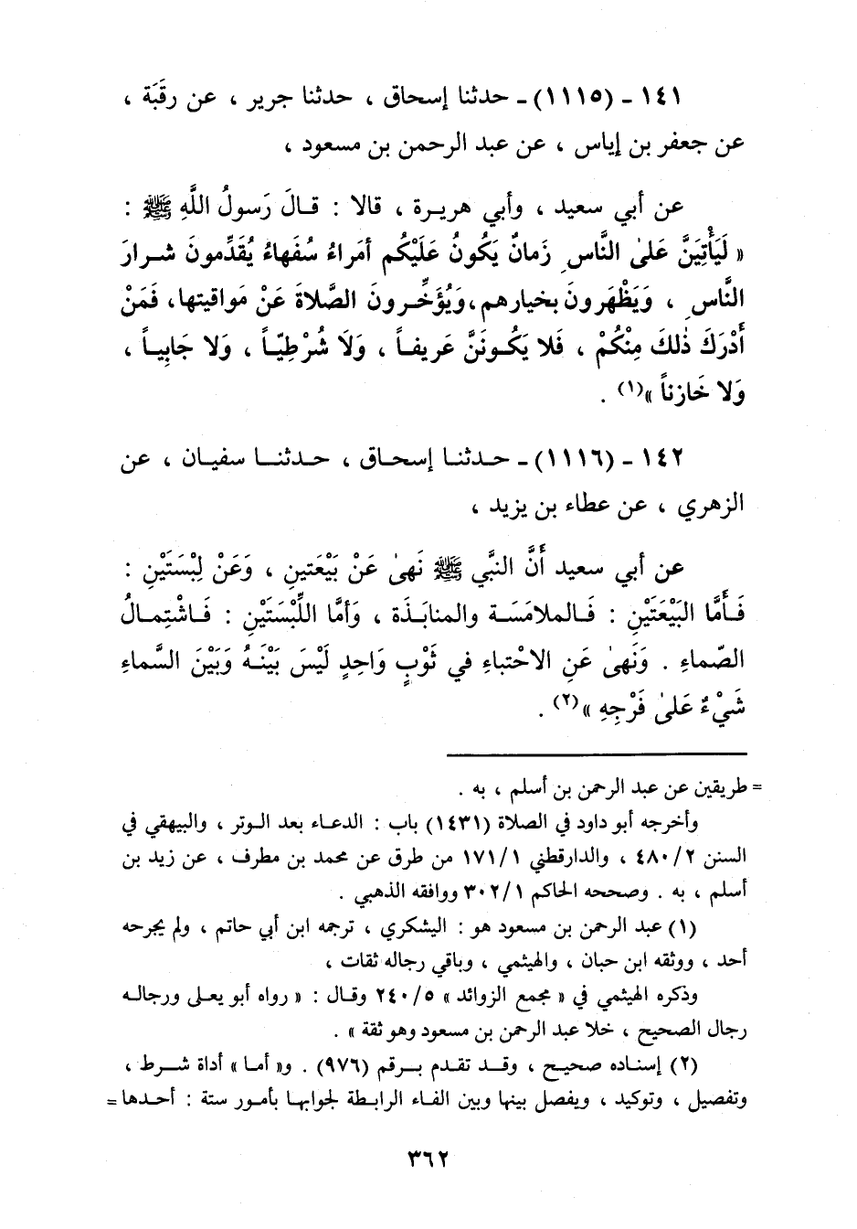 1116 - حَدَّثَنَا إِسْحَاقُ، حَدَّثَنَا سُفْيَانُ، عَنِ الزُّهْرِيِّ، عَنْ عَطَاءِ بْنِ يَزِيدَ، عَنْ أَبِي سَعِيدٍ، " أَنَّ النَّبِيَّ صَلَّى اللهُ عَلَيْهِ وَسَلَّمَ §نَهَى عَنْ بَيْعَتَيْنِ وَعَنْ لُبْسَتَيْنِ، فَأَمَّا الْبَيْعَتَيْنِ: فَالْمُلَامَسَةُ وَالْمُنَابَذَةُ، وَأَمَّا اللُّبْسَتَيْنِ: فَاشْتِمَالُ الصَّمَّاءِ، وَنَهَى عَنِ الِاحْتِبَاءِ فِي ثَوْبٍ وَاحِدٍ لَيْسَ بَيْنَهُ وَبَيْنَ السَّمَاءِ شَيْءٌ عَلَى فَرْجِهِ "Kإسناده صحيح