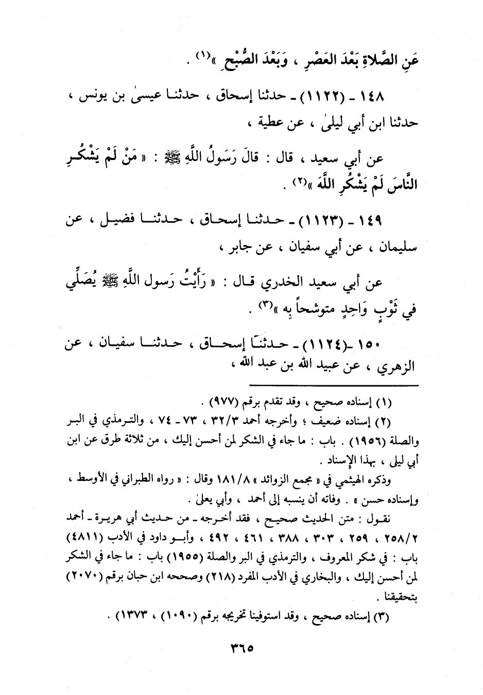 1122 - حَدَّثَنَا إِسْحَاقُ، حَدَّثَنَا عِيسَى بْنُ يُونُسَ، حَدَّثَنَا ابْنُ أَبِي لَيْلَى، عَنْ عَطِيَّةَ، عَنْ أَبِي سَعِيدٍ قَالَ: قَالَ رَسُولُ اللَّهِ صَلَّى اللهُ عَلَيْهِ وَسَلَّمَ: «§مَنْ لَمْ يَشْكُرِ النَّاسَ لَمْ يَشْكُرِ اللَّهَ» Kإسناده ضعيف