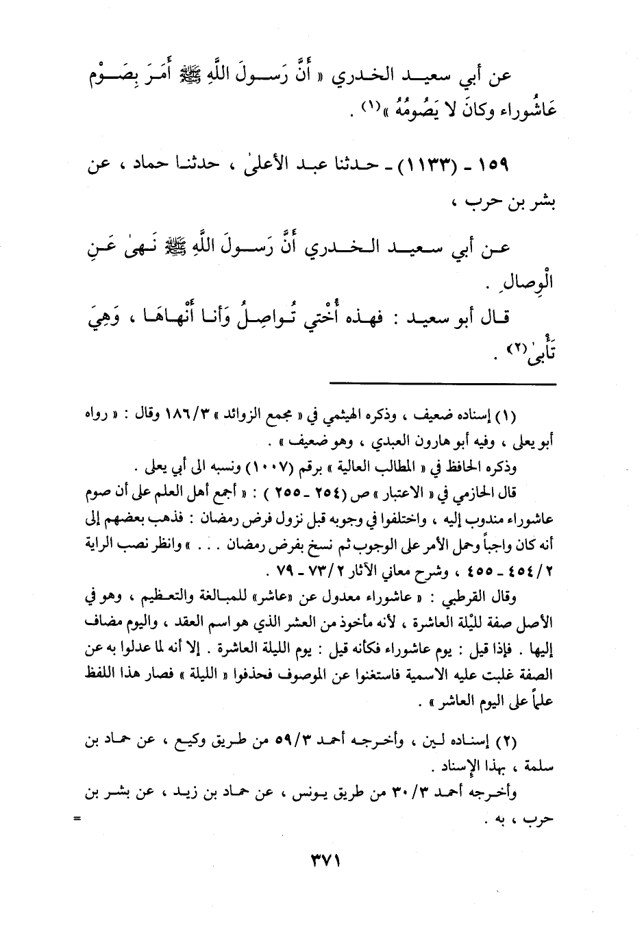 1133 - حَدَّثَنَا عَبْدُ الْأَعْلَى، حَدَّثَنَا حَمَّادٌ، عَنْ بِشْرِ بْنِ حَرْبٍ، عَنْ أَبِي سَعِيدٍ الْخُدْرِيِّ، «أَنَّ رَسُولَ اللَّهِ صَلَّى اللهُ عَلَيْهِ وَسَلَّمَ §نَهَى عَنِ الْوِصَالِ»، قَالَ أَبُو سَعِيدٍ: فَهَذِهِ أُخْتِي تُوَاصِلُ وَأَنَا أَنْهَاهَا وَهِيَ تَأْبَى "Kإسناده لين