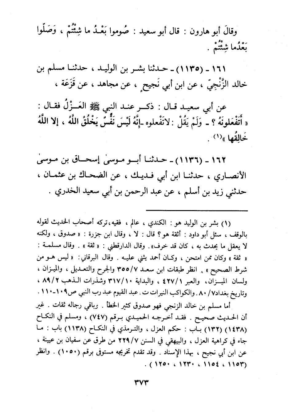 1135 - حَدَّثَنَا بِشْرُ بْنُ الْوَلِيدِ، حَدَّثَنَا مُسْلِمُ بْنُ خَالِدٍ الزَّنْجِيُّ، عَنِ ابْنِ أَبِي نَجِيحٍ، عَنْ مُجَاهِدٍ، عَنْ قَزْعَةَ، عَنْ أَبِي سَعِيدٍ قَالَ: ذُكِرَ عِنْدَ النَّبِيِّ صَلَّى اللهُ عَلَيْهِ وَسَلَّمَ الْعَزْلُ، فَقَالَ: " §أَتَفْعَلُونَهُ؟ - وَلَمْ يَقُلْ: لَا تَفْعَلُوهُ - إِنَّهُ لَيْسَ نَفْسٌ يَخْلُقُ اللَّهُ، إِلَّا اللَّهُ خَالِقُهَا "