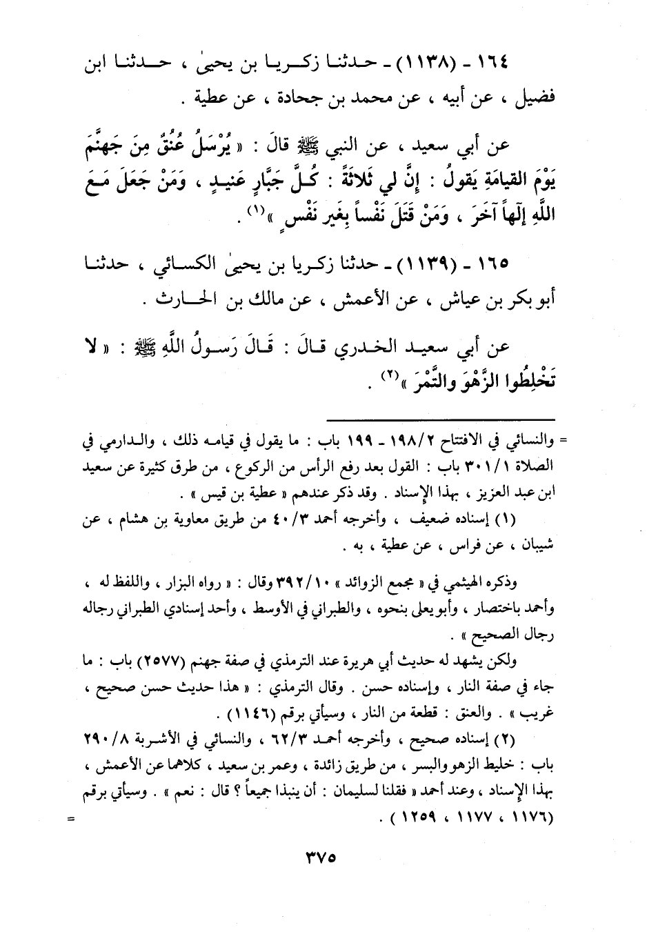 1138 - حَدَّثَنَا زَكَرِيَّا بْنُ يَحْيَى، حَدَّثَنَا ابْنُ فُضَيْلٍ، عَنْ أَبِيهِ، عَنْ مُحَمَّدِ بْنِ جُحَادَةَ، عَنْ عَطِيَّةَ، عَنْ أَبِي سَعِيدٍ، عَنِ النَّبِيِّ صَلَّى اللهُ عَلَيْهِ وَسَلَّمَ قَالَ: " §يُرْسَلُ عُنُقٌ مِنْ جَهَنَّمَ يَوْمَ الْقِيَامَةِ يَقُولُ: إِنَّ لِي ثَلَاثَةً: كُلَّ جَبَّارٍ عَنْيدٍ، وَمَنْ جَعَلَ مَعَ اللَّهِ إِلَهًا آخِرَ، وَمَنْ قَتَلَ نَفْسًا بِغَيْرِ نَفْسٍ "Kإسناده ضعيف