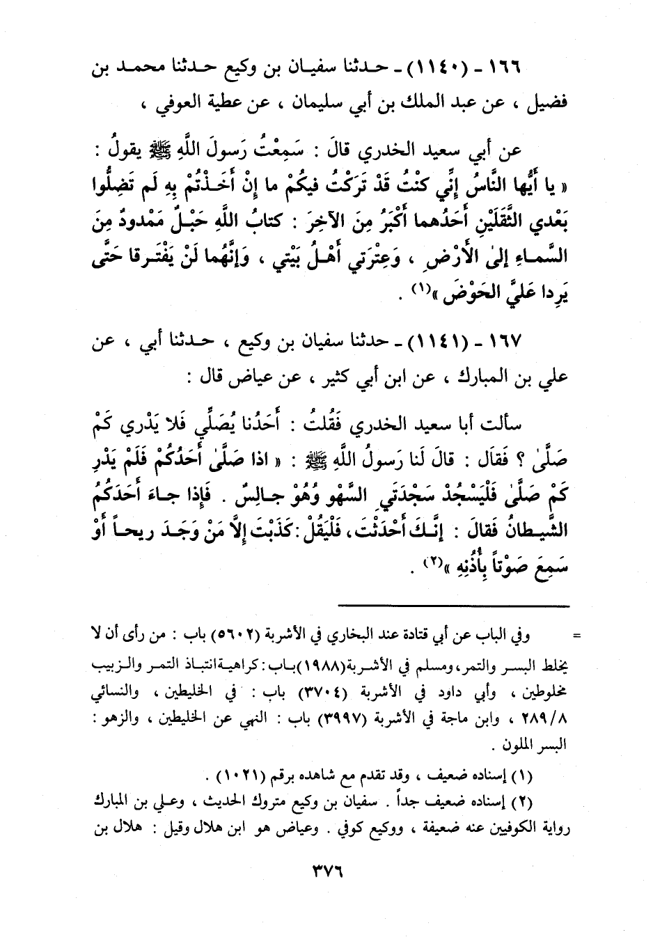 1140 - حَدَّثَنَا سُفْيَانُ بْنُ وَكِيعٍ، حَدَّثَنَا مُحَمَّدُ بْنُ فُضَيْلٍ، عَنْ عَبْدِ الْمَلِكِ بْنِ أَبِي سُلَيْمَانَ، عَنْ عَطِيَّةَ الْعَوْفِيِّ، عَنْ أَبِي سَعِيدٍ الْخُدْرِيِّ قَالَ: سَمِعْتُ رَسُولَ اللَّهِ صَلَّى اللهُ عَلَيْهِ وَسَلَّمَ يَقُولُ: " يَا أَيُّهَا النَّاسُ، §إِنِّي كُنْتُ قَدْ تَرَكْتُ فِيكُمْ مَا إِنْ أَخَذْتُمْ بِهِ لَمْ تَضِلُّوا بَعْدِي الثَّقَلَيْنِ أَحَدُهُمَا أَكْبَرُ مِنَ الْآخَرِ: كِتَابُ اللَّهِ حَبْلٌ مَمْدُودٌ مِنَ السَّمَاءِ إِلَى الْأَرْضِ، وَعِتْرَتِي أَهْلُ بَيْتِي، وَإِنَّهُمَا لَنْ يَفْتَرِقَا حَتَّى يَرِدَا عَلَيَّ الْحَوْضَ "Kإسناده ضعيف