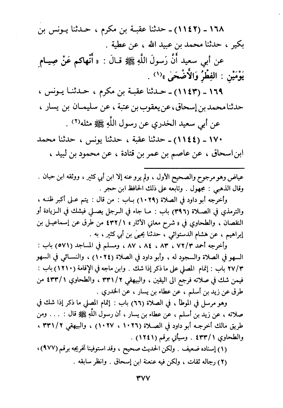 1143 - حَدَّثَنَا عُقْبَةُ بْنُ مُكْرَمٍ، حَدَّثَنَا يُونُسُ، حَدَّثَنَا مُحَمَّدُ بْنُ إِسْحَاقَ، عَنْ يَعْقُوبَ بْنِ عُتْبَةَ، عَنْ سُلَيْمَانَ بْنِ يَسَارٍ، عَنْ أَبِي سَعِيدٍ الْخُدْرِيِّ، عَنْ رَسُولِ اللَّهِ صَلَّى اللهُ عَلَيْهِ وَسَلَّمَ: مِثْلَهُKرجاله ثقات