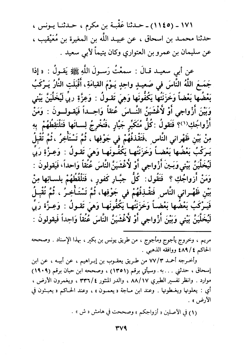1145 - حَدَّثَنَا عُقْبَةُ بْنُ مُكْرَمٍ، حَدَّثَنَا يُونُسُ، حَدَّثَنَا مُحَمَّدُ بْنُ إِسْحَاقَ، عَنْ عُبَيْدِ اللَّهِ بْنِ الْمُغِيرَةِ بْنِ مُعَيْقِيبٍ، عَنْ سُلَيْمَانَ بْنِ عَمْرِو بْنِ الْعُتْوَارِيِّ، وَكَانَ يَتِيمًا لِأَبِي سَعِيدٍ، عَنْ أَبِي سَعِيدٍ قَالَ: سَمِعْتُ رَسُولَ اللَّهِ صَلَّى اللهُ عَلَيْهِ وَسَلَّمَ يَقُولُ: " §إِذَا جَمَعَ اللَّهُ النَّاسَ فِي صَعِيدٍ وَاحِدٍ يَوْمَ الْقِيَامَةِ، أَقْبَلْتِ النَّارُ يَرْكَبُ بَعْضُهَا بَعْضًا، وَخَزَنَتُهَا يَكُفُّونَهَا، وَهِيَ تَقُولُ: وَعِزَّةِ رَبِّي لَيُخْلَيَنَّ بَيْنِي وَبَيْنَ أَزْوَاجِي أَوْ لَأَغْشَيَنَّ النَّاسَ عُنُقًا وَاحِدًا فَيَقُولُونَ: وَمَنْ أَزْوَاجُكِ؟ فَتَقُولُ: كُلُّ مُتَكَبِّرٍ جُبَارٍ، فَتُخْرُجُ لِسَانَهَا فَتَلْتَقِطُهُمْ بِهِ مِنْ بَيْنِ ظَهْرَانَيِ النَّاسِ، فَتَقْذِفُهُمْ فِي جَوْفِهَا، ثُمَّ تَسْتَأْخِرُ، ثُمَّ تُقْبِلُ يَرْكَبُ بَعْضُهَا بَعْضًا، وَخَزَنَتُهَا يَكُفُّونَهَا وَهِيَ تَقُولُ: وَعِزَّةِ رَبِّي لَيُخَلَّيَنَّ بَيْنِي وَبَيْنَ أَزْوَاجِي أَوْ لَأَغْشَيَنَّ النَّاسَ عُنُقًا وَاحِدًا، فَيَقُولُونَ: وَمَنْ أَزْوَاجُكِ؟ فَتَقُولُ: كُلُّ جُبَارٍ كَفُورٍ، فَتَلْقُطُهُمْ بِلِسَانِهَا مِنْ بَيْنِ ظَهْرَانَيِ النَّاسِ فَتَقْذِفُهُمْ فِي جَوْفِهَا، ثُمَّ تَسْتَأْخِرُ ثُمَّ تُقْبِلُ فَيَرْكَبُ بَعْضُهَا بَعْضًا وَخَزَنَتُهَا يَكُفُّونَهَا وَهِيَ تَقُولُ: وَعِزَّةِ رَبِّي لَيُخَلَّيَنَّ بَيْنِي وَبَيْنَ أَزْوَاجِي أَوْ لَأَغْشَيَنَّ النَّاسَ عُنُقًا وَاحِدًا، فَيَقُولُونَ: مَنْ أَزْوَاجُكِ؟ فَتَقُولُ: كُلُّ مُخْتَالٍ فَخُورٍ، فَتَلْقُطُهُمْ بِلِسَانِهَا مِنْ بَيْنِ ظَهْرَانَيِ النَّاسِ، فَتَقْذِفُهُمْ فِي جَوْفِهَا ثُمَّ تَسْتَأْخِرُ، وَيَقْضِي اللَّهُ بَيْنَ الْعِبَادِ "Kرجاله ثقات