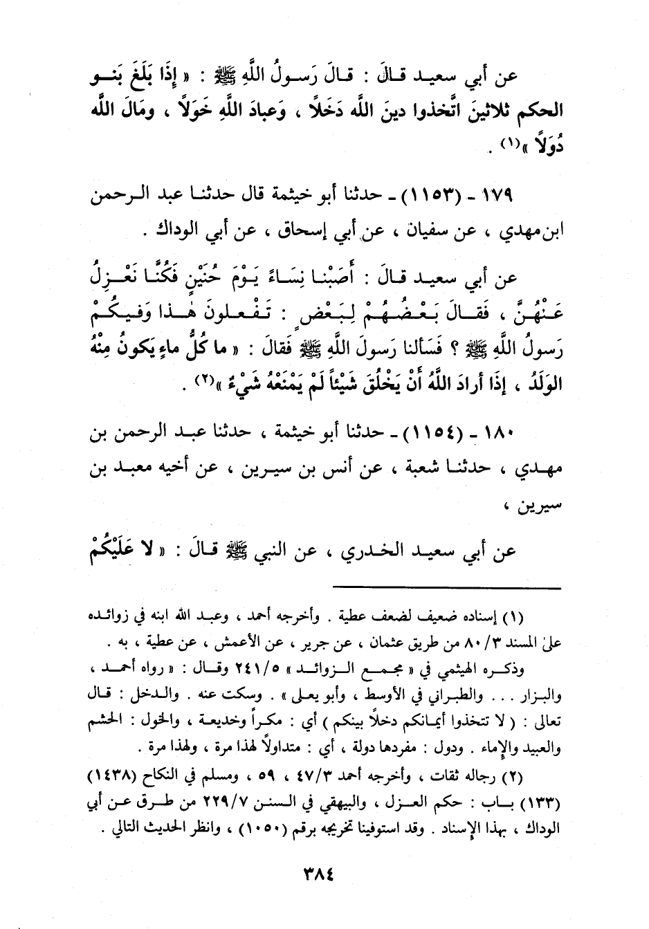 1153 - حَدَّثَنَا أَبُو خَيْثَمَةَ قَالَ: حَدَّثَنَا عَبْدُ الرَّحْمَنِ بْنُ مَهْدِيٍّ، عَنْ سُفْيَانَ، عَنْ أَبِي إِسْحَاقَ، عَنْ أَبِي الْوَدَّاكِ، عَنْ أَبِي سَعِيدٍ قَالَ: أَصَبْنَا نِسَاءً يَوْمَ حُنَيْنٍ فَكُنَّا نَعْزِلُ عَنْهُنَّ، فَقَالَ بَعْضُنَا لِبَعْضٍ: تَفْعَلُونَ هَذَا وَفِيكُمْ رَسُولُ اللَّهِ صَلَّى اللهُ عَلَيْهِ وَسَلَّمَ؟ فَسَأَلْنَا رَسُولَ اللَّهِ صَلَّى اللهُ عَلَيْهِ وَسَلَّمَ فَقَالَ: «§مَا كُلُّ مَاءٍ يَكُونُ مِنْهُ الْوَلَدُ، إِذَا أَرَادَ اللَّهُ أَنْ يَخْلُقَ شَيْئًا لَمْ يَمْنَعْهُ شَيْءٌ» Kرجاله ثقات