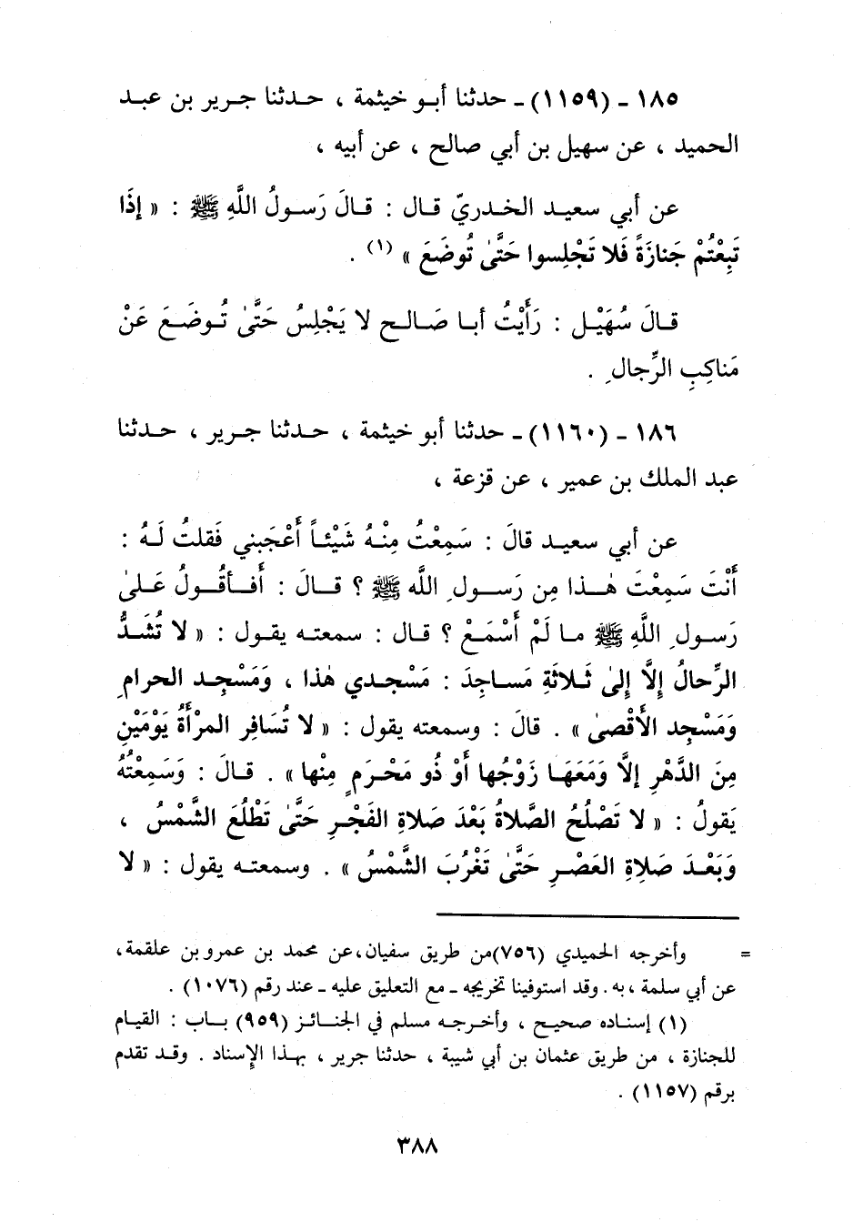 1159 - حَدَّثَنَا أَبُو خَيْثَمَةَ، حَدَّثَنَا جَرِيرُ بْنُ عَبْدِ الْحَمِيدِ، عَنْ سُهَيْلِ بْنِ أَبِي صَالِحٍ، عَنْ أَبِيهِ، عَنْ أَبِي سَعِيدٍ الْخُدْرِيِّ قَالَ: قَالَ رَسُولُ اللَّهِ صَلَّى اللهُ عَلَيْهِ وَسَلَّمَ: «§إِذَا تَبِعْتُمْ جَنَازَةً فَلَا تَجْلِسُوا حَتَّى تُوضَعَ» قَالَ سُهَيْلٌ: رَأَيْتُ أَبَا صَالِحٍ لَا يَجْلِسُ حَتَّى تُوضَعَ عَنْ مَنَاكِبِ الرِّجَالِ "Kإسناده صحيح