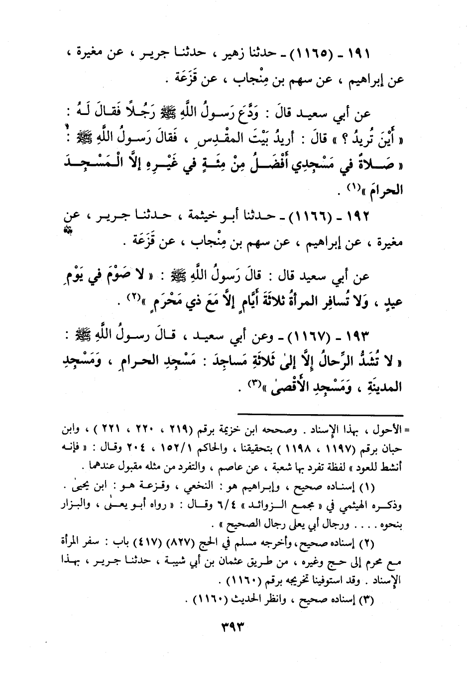 1167 - وَعَنْ أَبِي سَعِيدٍ، قَالَ رَسُولُ اللَّهِ صَلَّى اللهُ عَلَيْهِ وَسَلَّمَ: " §لَا تُشَدُّ الرِّحَالُ إِلَّا إِلَى ثَلَاثَةِ مَسَاجِدَ: مَسْجِدِ الْحَرَامِ، وَمَسْجِدِ الْمَدِينَةِ، وَمَسْجِدِ الْأَقْصَى "Kإسناده صحيح