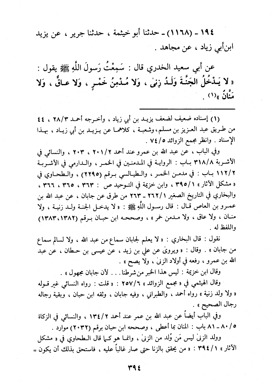 1168 - حَدَّثَنَا أَبُو خَيْثَمَةَ، حَدَّثَنَا جَرِيرٌ، عَنْ يَزِيدَ بْنِ أَبِي زِيَادٍ، عَنْ مُجَاهِدٍ، عَنْ أَبِي سَعِيدٍ الْخُدْرِيِّ قَالَ: سَمِعْتُ رَسُولَ اللَّهِ صَلَّى اللهُ عَلَيْهِ وَسَلَّمَ يَقُولُ: «§لَا يَدْخُلُ الْجَنَّةَ وَلَدُ زَنًى، وَلَا مُدْمِنُ خَمْرٍ، وَلَا عَاقٌّ، وَلَا مَنَّانٌ» Kإسناده ضعيف