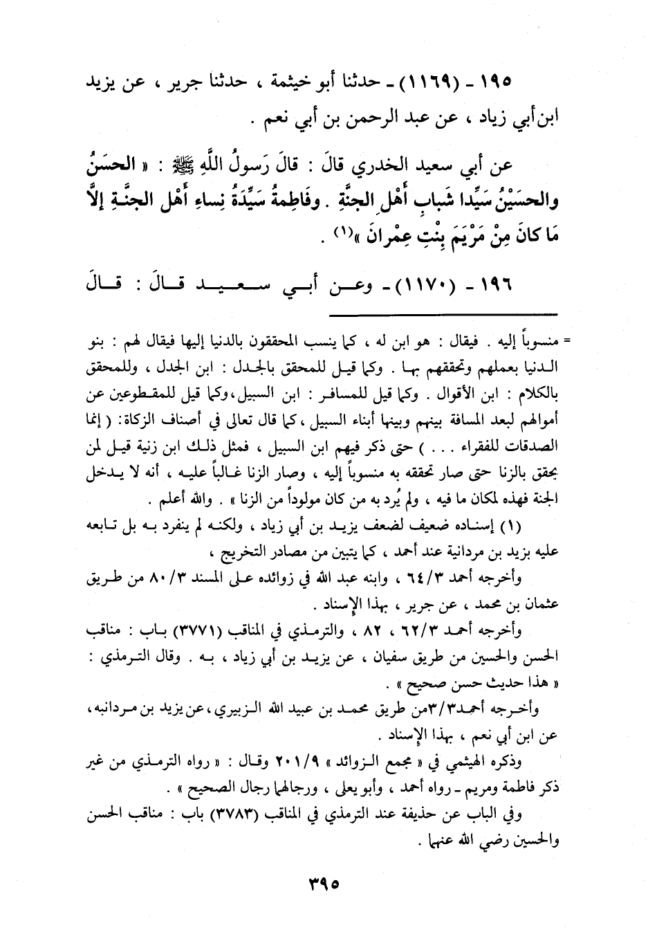 1169 - حَدَّثَنَا أَبُو خَيْثَمَةَ، حَدَّثَنَا جَرِيرٌ، عَنْ يَزِيدَ بْنِ أَبِي زِيَادٍ، عَنْ عَبْدِ الرَّحْمَنِ بْنِ أَبِي نُعْمَ، عَنْ أَبِي سَعِيدٍ الْخُدْرِيِّ قَالَ: قَالَ رَسُولُ اللَّهِ صَلَّى اللهُ عَلَيْهِ وَسَلَّمَ: «§الْحَسَنُ وَالْحُسَيْنُ سَيِّدَا شَبَابِ أَهْلِ الْجَنَّةِ، وَفَاطِمَةُ سَيِّدَةُ نِسَاءِ أَهْلِ الْجَنَّةِ، إِلَّا مَا كَانَ مِنْ مَرْيَمَ بِنْتِ عِمْرَانَ» Kإسناده ضعيف