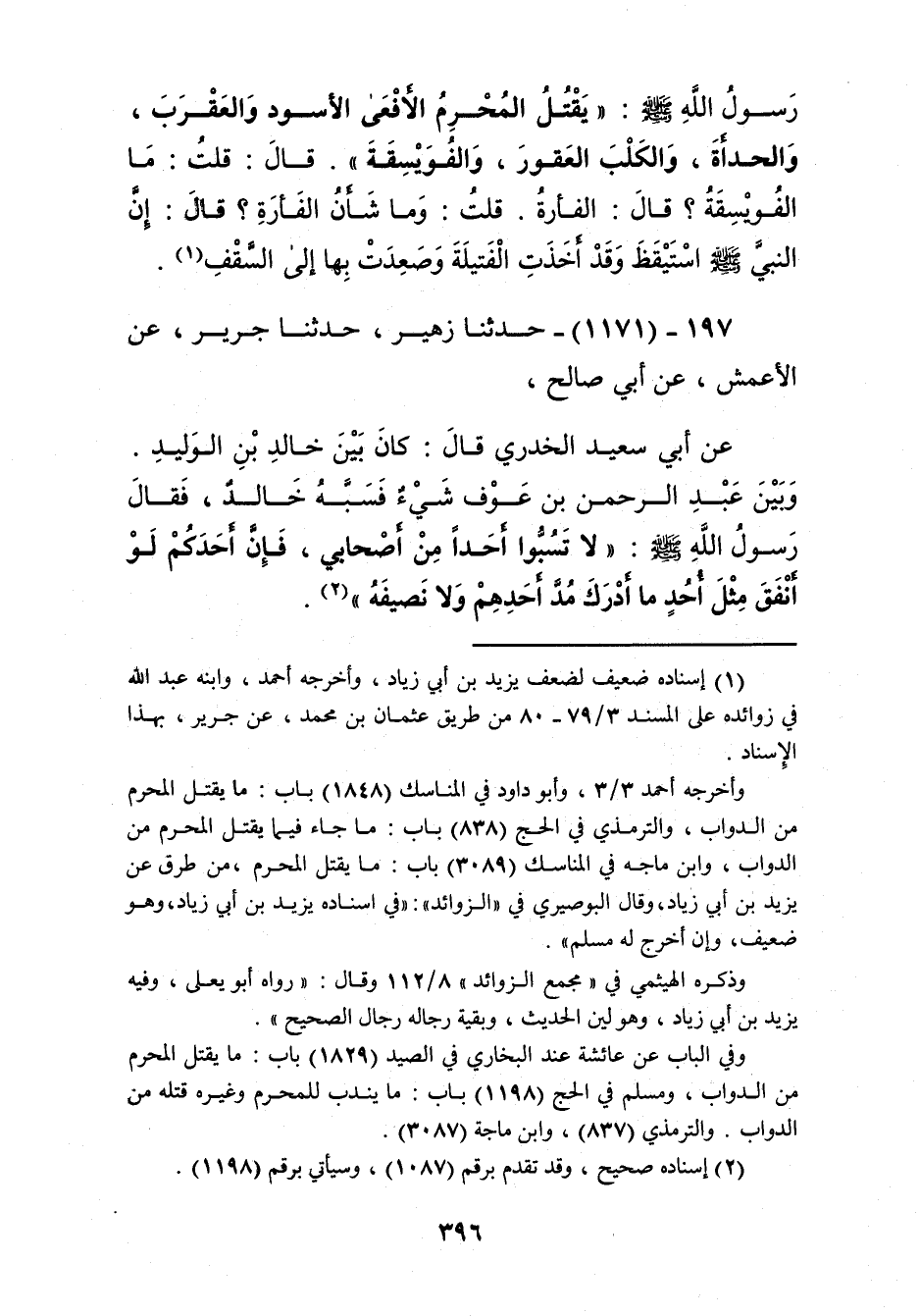 1171 - حَدَّثَنَا زُهَيْرٌ، حَدَّثَنَا جَرِيرٌ، عَنِ الْأَعْمَشِ، عَنْ أَبِي صَالِحٍ، عَنْ أَبِي سَعِيدٍ الْخُدْرِيِّ قَالَ: كَانَ بَيْنَ خَالِدِ بْنِ الْوَلِيدِ وَبَيْنَ عَبْدِ الرَّحْمَنِ بْنِ عَوْفٍ شَيْءٌ، فَسَبَّهُ خَالِدٌ، فَقَالَ رَسُولُ اللَّهِ صَلَّى اللهُ عَلَيْهِ وَسَلَّمَ: «§لَا تَسُبُّوا أَحَدًا مِنْ أَصْحَابِي، فَإِنَّ أَحَدَكُمْ لَوْ أَنْفَقَ مِثْلَ أُحُدٍ مَا أَدْرَكَ مُدَّ أَحَدِهِمْ وَلَا نَصِيفَهُ» Kإسناده صحيح