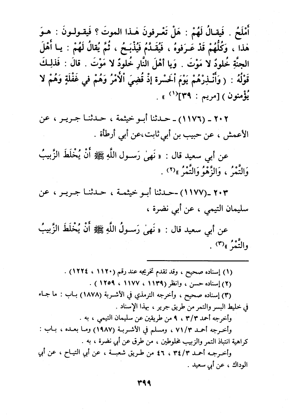 1177 - حَدَّثَنَا أَبُو خَيْثَمَةَ، حَدَّثَنَا جَرِيرٌ، عَنْ سُلَيْمَانَ التَّيْمِيِّ، عَنْ أَبِي نَضْرَةَ، عَنْ أَبِي سَعِيدٍ قَالَ: «§نَهَى رَسُولُ اللَّهِ صَلَّى اللهُ عَلَيْهِ وَسَلَّمَ أَنْ يُخْلَطَ الزَّبِيبُ وَالتَّمْرُ» Kإسناده صحيح