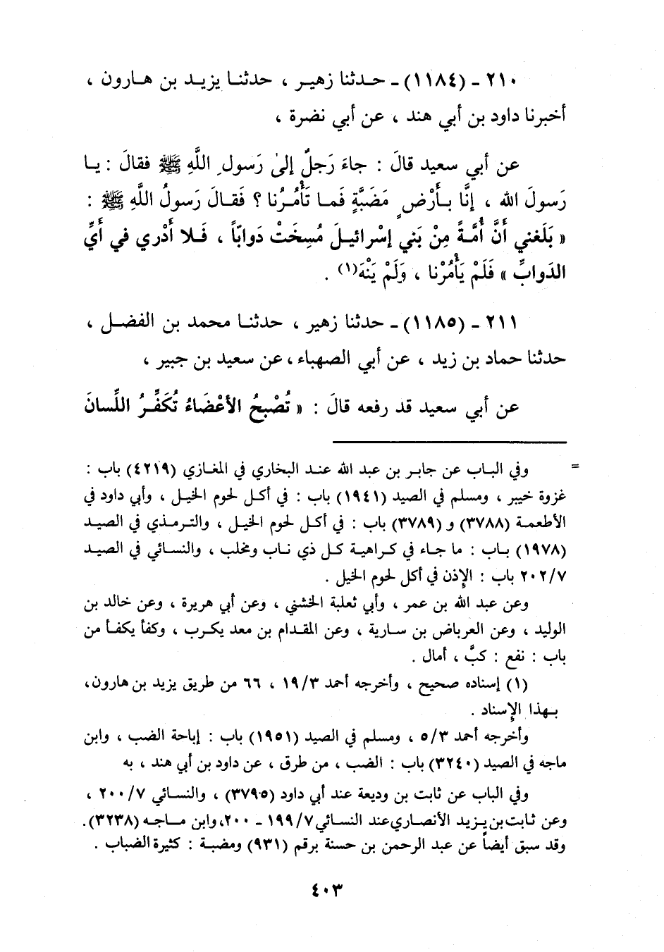 1184 - حَدَّثَنَا زُهَيْرٌ، حَدَّثَنَا يَزِيدُ بْنُ هَارُونَ، أَخْبَرَنَا دَاوُدُ بْنُ أَبِي هِنْدَ، عَنْ أَبِي نَضْرَةَ، عَنْ أَبِي سَعِيدٍ قَالَ: جَاءَ رَجُلٌ إِلَى رَسُولِ اللَّهِ صَلَّى اللهُ عَلَيْهِ وَسَلَّمَ فَقَالَ: يَا رَسُولَ اللَّهِ، إِنَّا بِأَرْضٍ مَضَبَّةٍ فَمَا تَأْمُرُنَا؟ فَقَالَ رَسُولُ اللَّهِ صَلَّى اللهُ عَلَيْهِ وَسَلَّمَ: «§بَلَغَنِي أَنَّ أَمَّةً مِنْ بَنِي إِسْرَائِيلَ مُسِخَتْ دَوَابًّا، فَلَا أَدْرِي فِي أَيِّ الدَّوَابِّ» فَلَمْ يَأْمُرْنَا وَلَمْ يَنْهَKإسناده صحيح