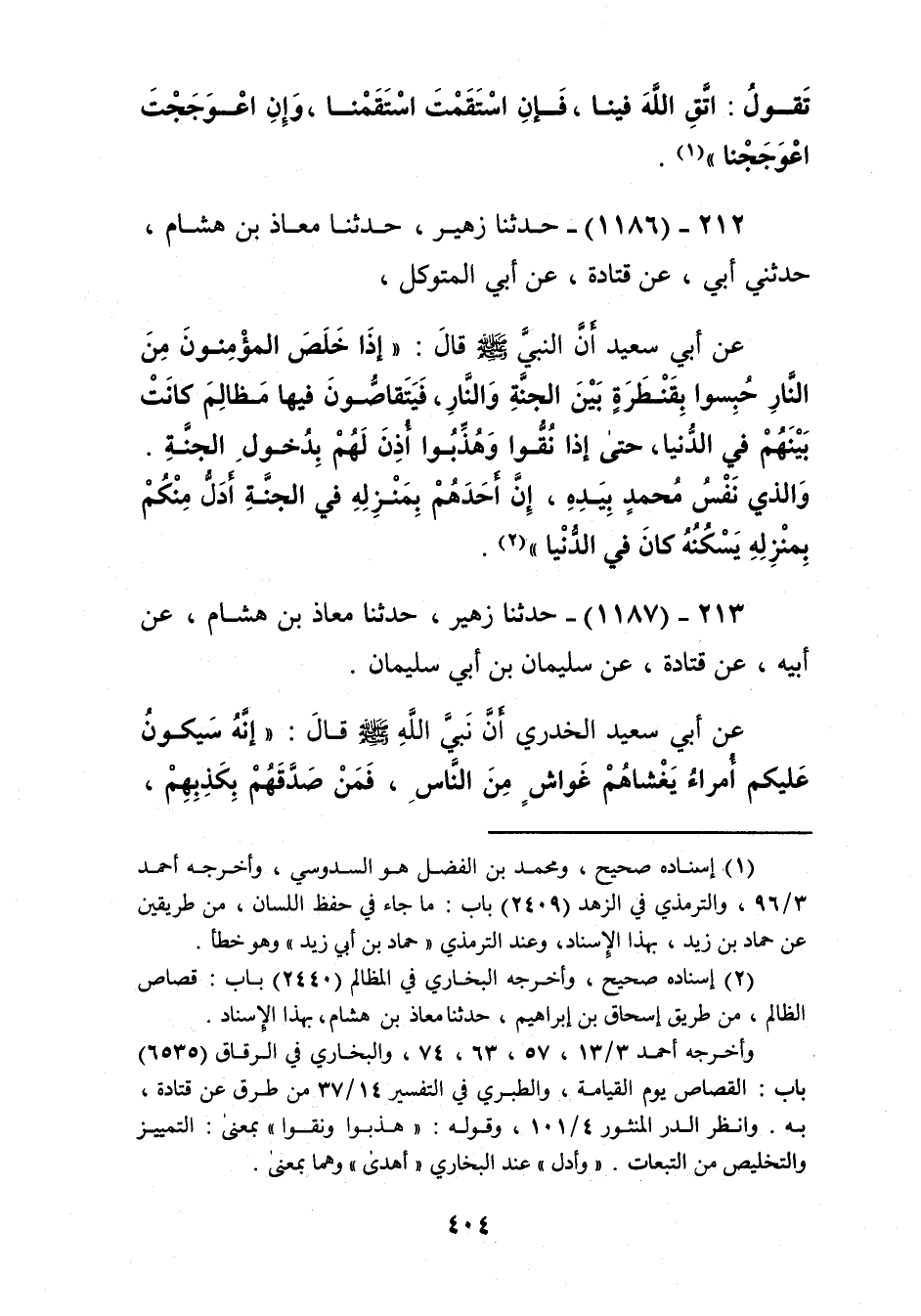 1186 - حَدَّثَنَا زُهَيْرٌ، حَدَّثَنَا مُعَاذُ بْنُ هِشَامٍ، حَدَّثَنِي أَبِي، عَنْ قَتَادَةَ، عَنْ أَبِي الْمُتَوَكِّلِ، عَنْ أَبِي سَعِيدٍ، أَنَّ النَّبِيَّ صَلَّى اللهُ عَلَيْهِ وَسَلَّمَ قَالَ: «§إِذَا خَلَصَ الْمُؤْمِنُونَ مِنَ النَّارِ حُبِسُوا بِقَنْطَرَةٍ بَيْنَ الْجَنَّةِ وَالنَّارِ، فَيَتَقَاصُّونَ فِيهَا مَظَالِمَ كَانَتْ بَيْنَهُمْ فِي الدُّنْيَا، حَتَّى إِذَا نُقُّوا وَهُذِّبُوا أُذِنَ لَهُمْ بِدُخُولِ الْجَنَّةِ، وَالَّذِي نَفْسُ مُحَمَّدٍ بِيَدِهِ إِنَّ أَحَدَهُمْ بِمَنْزِلِهِ فِي الْجَنَّةِ أَدَلُّ مِنْكُمْ بِمَنْزِلِهِ يَسْكُنُهُ كَانَ فِي الدُّنْيَا» Kإسناده صحيح