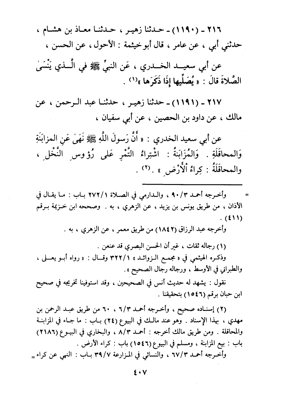 1191 - حَدَّثَنَا زُهَيْرٌ، حَدَّثَنَا عَبْدُ الرَّحْمَنِ، عَنْ مَالِكٍ، عَنْ دَاوُدَ بْنِ الْحُصَيْنِ، عَنْ أَبِي سُفْيَانَ، عَنْ أَبِي سَعِيدٍ الْخُدْرِيِّ، «أَنَّ رَسُولَ اللَّهِ صَلَّى اللهُ عَلَيْهِ وَسَلَّمَ §نَهَى عَنِ الْمُزَابَنَةِ وَالْمُحَاقَلَةِ»، وَالْمُزَابَنَةُ: اشْتِرَاءُ التَّمْرِ عَلَى رُءُوسِ النَّخْلِ، وَالْمُحَاقَلَةُ: كِرَاءُ الْأَرْضِKإسناده صحيح