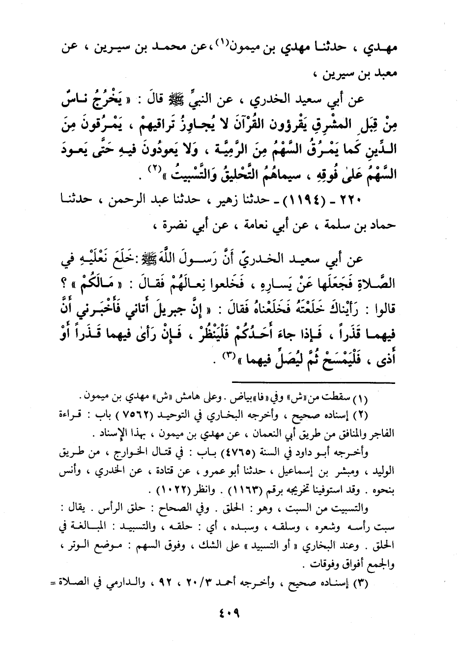 1194 - حَدَّثَنَا زُهَيْرٌ، حَدَّثَنَا عَبْدُ الرَّحْمَنِ، حَدَّثَنَا حَمَّادُ بْنُ سَلَمَةَ، عَنْ أَبِي نَعَامَةَ، عَنْ أَبِي نَضْرَةَ، عَنْ أَبِي سَعِيدٍ الْخُدْرِيِّ، أَنَّ رَسُولَ اللَّهِ صَلَّى اللهُ عَلَيْهِ وَسَلَّمَ خَلَعَ نَعْلَيْهِ فِي الصَّلَاةِ فَجَعَلَهَا عَنْ يَسَارِهِ، فَخَلَعُوا نِعَالَهُمْ، فَقَالَ: «مَا لَكُمْ؟»، قَالُوا: §رَأَيْنَاكَ خَلَعْتَهُ فَخَلَعْنَاهُ، فَقَالَ: «إِنَّ جِبْرِيلَ أَتَانِي فَأَخْبَرَنِي أَنَّ فِيهِمَا قَذَرًا، فَإِذَا جَاءَ أَحَدُكُمْ فَلْيَنْظُرْ، فَإِنْ رَأَى فِيهِمَا قَذَرًا أَوْ أَذًى فَلْيَمْسَحْ ثُمَّ لِيُصَلِّ فِيهِمَا» Kإسناده صحيح