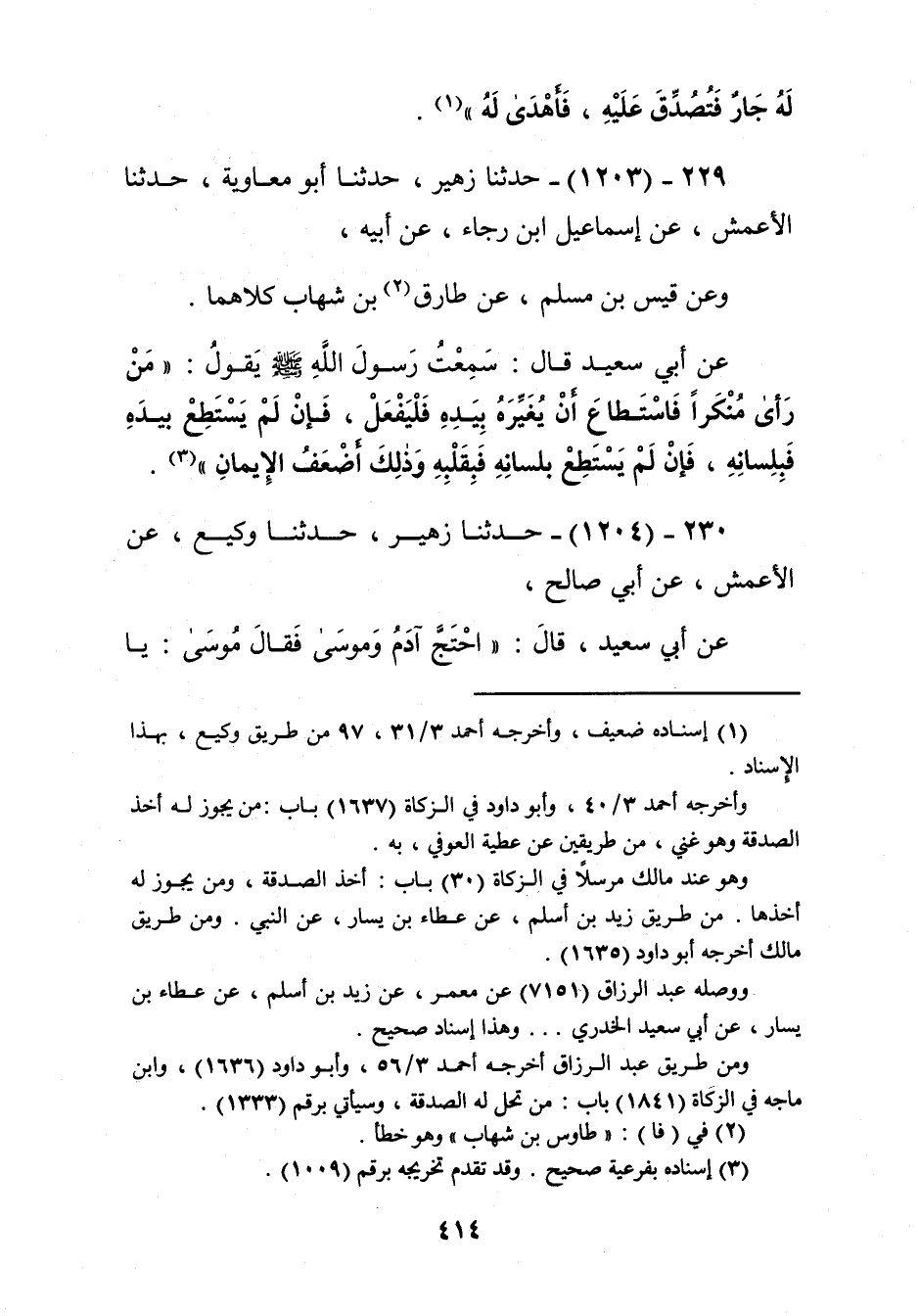 1203 - حَدَّثَنَا زُهَيْرٌ، حَدَّثَنَا أَبُو مُعَاوِيَةَ، حَدَّثَنَا الْأَعْمَشُ، عَنْ إِسْمَاعِيلَ بْنِ رَجَاءٍ، عَنْ أَبِيهِ، وَعَنْ قَيْسِ بْنِ مُسْلِمٍ،، عَنْ طَارِقِ بْنِ شِهَابٍ، كِلَاهُمَا، عَنْ أَبِي سَعِيدٍ قَالَ: سَمِعْتُ رَسُولَ اللَّهِ صَلَّى اللهُ عَلَيْهِ وَسَلَّمَ يَقُولُ: «§مَنْ رَأَى مُنْكَرًا فَاسْتَطَاعَ أَنْ يُغَيِّرَهُ بِيَدِهِ فَلْيَفْعَلْ، فَإِنْ لَمْ يَسْتَطِعْ بِيَدِهِ فَبِلِسَانِهِ، فَإِنْ لَمْ يَسْتَطِعْ بِلِسَانِهِ فَبِقَلْبِهِ، وَذَلِكَ أَضْعَفُ الْإِيمَانِ» Kإسناده بفرعيه صحيح