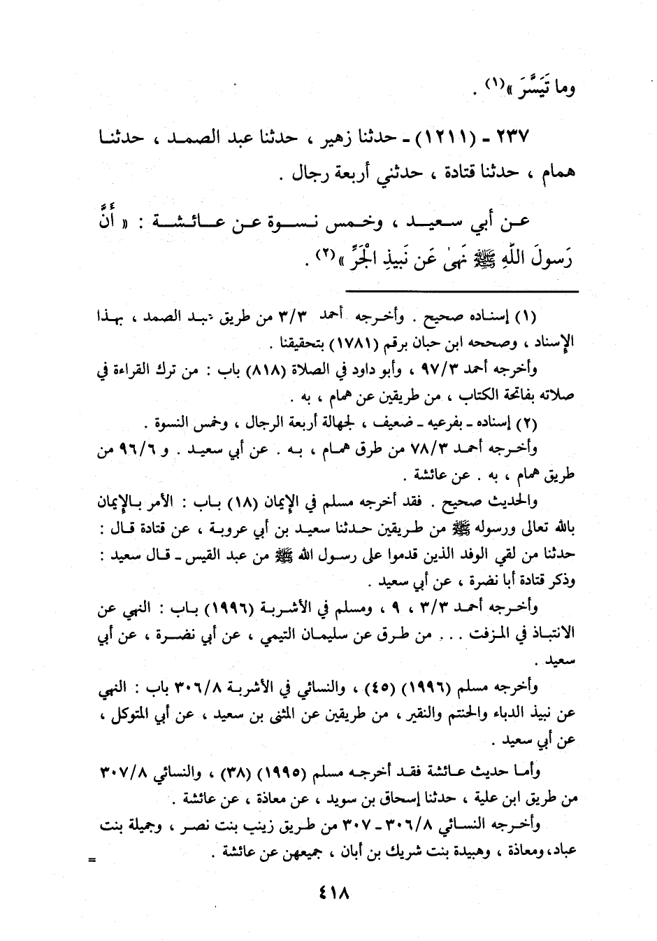 1211 - حَدَّثَنَا زُهَيْرٌ، حَدَّثَنَا عَبْدُ الصَّمَدِ، حَدَّثَنَا هَمَّامٌ، حَدَّثَنَا قَتَادَةُ، حَدَّثَنِي أَرْبَعَةُ رِجَالٍ، عَنْ أَبِي سَعِيدٍ،، وَخَمْسُ نِسْوَةٍ، عَنْ عَائِشَةَ، «أَنَّ رَسُولَ اللَّهِ صَلَّى اللهُ عَلَيْهِ وَسَلَّمَ §نَهَى عَنْ نَبِيذِ الْجَرِّ» Kإسناده بفرعيه ضعيف