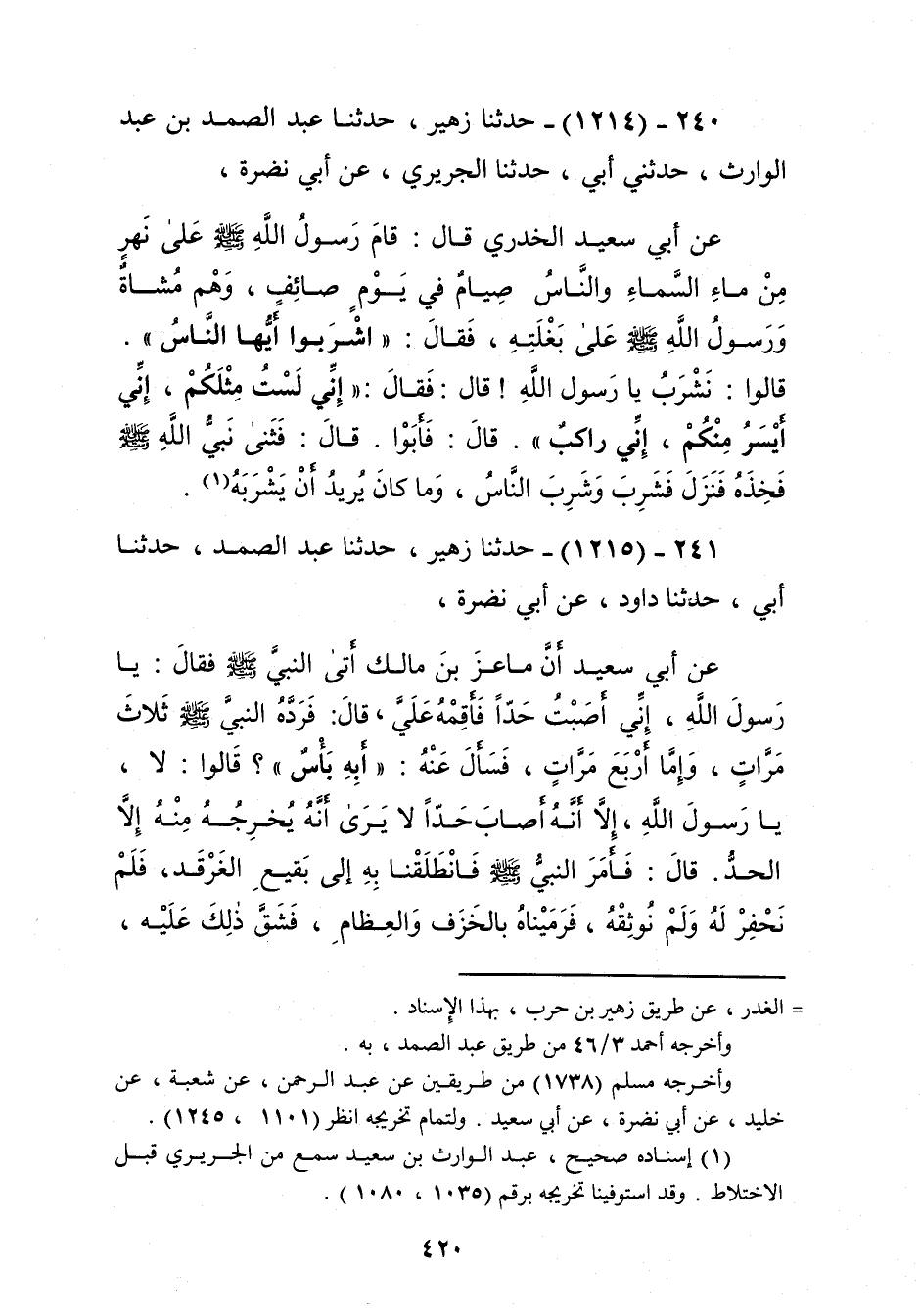 1214 - حَدَّثَنَا زُهَيْرٌ، حَدَّثَنَا عَبْدُ الصَّمَدِ بْنُ عَبْدِ الْوَارِثِ، حَدَّثَنِي أَبِي، حَدَّثَنَا الْجُرَيْرِيُّ، عَنْ أَبِي نَضْرَةَ، عَنْ أَبِي سَعِيدٍ الْخُدْرِيِّ قَالَ: قَامَ رَسُولُ اللَّهِ صَلَّى اللهُ عَلَيْهِ وَسَلَّمَ عَلَى نَهَرٍ مِنْ مَاءِ السَّمَاءِ وَالنَّاسُ صِيَامٌ فِي يَوْمٍ صَائِفٍ، وَهُمْ مُشَاةٌ وَرَسُولُ اللَّهِ صَلَّى اللهُ عَلَيْهِ وَسَلَّمَ عَلَى بَغْلَتِهِ، فَقَالَ: «§اشْرَبُوا أَيُّهَا النَّاسُ»، قَالُوا: نَشْرَبُ يَا رَسُولَ اللَّهِ قَالَ: فَقَالَ: «إِنِّي لَسْتُ مِثْلَكُمْ، إِنِّي أَيْسَرُ مِنْكُمْ، إِنِّي رَاكِبٌ»، قَالَ: فَأَبَوْا، قَالَ: فَثَنَى نَبِيُّ اللَّهِ صَلَّى اللهُ عَلَيْهِ وَسَلَّمَ فَخِذَهُ فَنَزَلَ فَشَرِبَ وَشَرِبَ النَّاسُ، وَمَا كَانَ يُرِيدُ أَنْ يَشْرَبَهُKإسناده صحيح