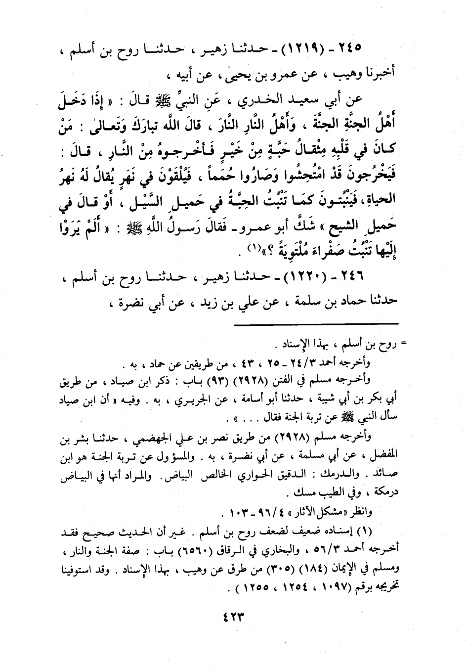 1219 - حَدَّثَنَا زُهَيْرٌ، حَدَّثَنَا رَوْحُ بْنُ أَسْلَمَ، أَخْبَرَنَا وُهَيْبٌ، عَنْ عَمْرِو بْنِ يَحْيَى، عَنْ أَبِيهِ، عَنْ أَبِي سَعِيدٍ الْخُدْرِيِّ، عَنِ النَّبِيِّ صَلَّى اللهُ عَلَيْهِ وَسَلَّمَ قَالَ: " §إِذَا دَخَلَ أَهْلُ الْجَنَّةِ الْجَنَّةَ، وَأَهْلُ النَّارِ النَّارَ، قَالَ اللَّهُ تَبَارَكَ وَتَعَالَى: مَنْ كَانَ فِي قَلْبِهِ مِثْقَالُ حَبَّةٍ مِنْ خَيْرٍ فَأَخْرِجُوهُ مِنَ النَّارِ، قَالَ: فَيُخْرَجُونَ قَدِ امْتَحَشُوا وَصَارُوا حُمَمًا، فَيُلْقَوْنَ فِي نَهَرٍ يُقَالُ لَهُ: نَهَرُ الْحَيَاةِ، فَيَنْبُتُونَ كَمَا تَنْبُتُ الْحِبَّةُ فِي حَمِيلِ السَّيْلِ " - أَوْ قَالَ: فِي حَمِيلِ الشَّيحِ شَكَّ أَبُو عَمْرٍو - فَقَالَ رَسُولُ اللَّهِ صَلَّى اللهُ عَلَيْهِ وَسَلَّمَ: «أَلَمْ يَرَوْا إِلَيْهَا تَنْبُتُ صَفْرَاءَ مُلْتَوِيَةً؟» Kإسناده ضعيف