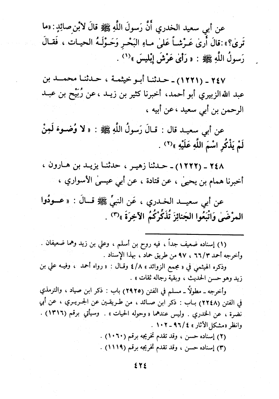 1221 - حَدَّثَنَا أَبُو خَيْثَمَةَ، حَدَّثَنَا مُحَمَّدُ بْنُ عَبْدِ اللَّهِ الزُّبَيْرِيُّ أَبُو أَحْمَدَ، أَخْبَرَنَا كَثِيرُ بْنُ زَيْدٍ، عَنْ رُبَيْحِ بْنِ عَبْدِ الرَّحْمَنِ بْنِ أَبِي سَعِيدٍ، عَنْ أَبِيهِ، عَنْ أَبِي سَعِيدٍ قَالَ: قَالَ رَسُولُ اللَّهِ صَلَّى اللهُ عَلَيْهِ وَسَلَّمَ: «§لَا وَضُوءَ لِمَنْ لَمْ يُذْكَرِ اسْمَ اللَّهِ عَلَيْهِ» Kإسناده حسن
