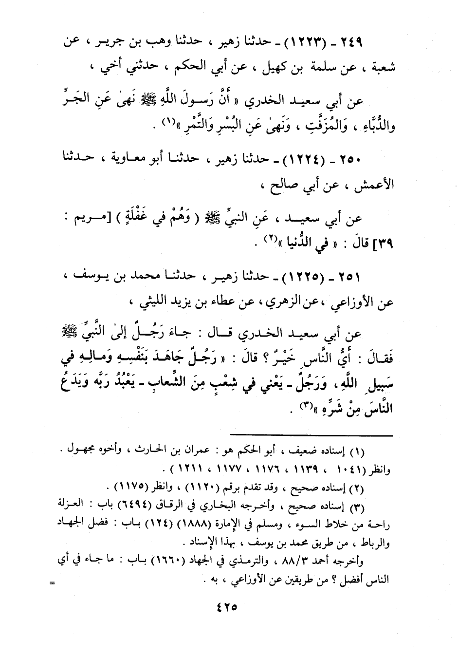 1225 - حَدَّثَنَا زُهَيْرٌ، حَدَّثَنَا مُحَمَّدُ بْنُ يُوسُفَ، عَنِ الْأَوْزَاعِيِّ، عَنِ الزُّهْرِيِّ، عَنْ عَطَاءِ بْنِ يَزِيدَ اللَّيْثِيِّ، عَنْ أَبِي سَعِيدٍ الْخُدْرِيِّ قَالَ: جَاءَ رَجُلٌ إِلَى النَّبِيِّ صَلَّى اللهُ عَلَيْهِ وَسَلَّمَ فَقَالَ: أَيُّ النَّاسِ خَيْرٌ؟ قَالَ: «§رَجُلٌ جَاهَدَ بِنَفْسِهِ وَمَالِهِ فِي سَبِيلِ اللَّهِ، وَرَجُلٌ - يَعْنِي فِي شِعْبٍ مِنَ الشِّعَابِ - يَعْبُدُ رَبَّهُ وَيَدَعُ النَّاسَ مِنْ شَرِّهِ» Kإسناده صحيح