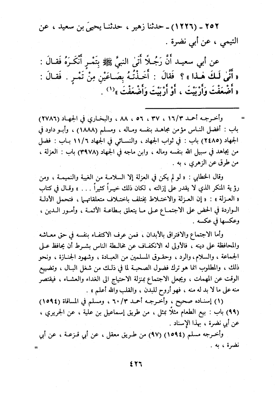 1226 - حَدَّثَنَا زُهَيْرٌ، حَدَّثَنَا يَحْيَى بْنُ سَعِيدٍ، عَنِ التَّيْمِيِّ، عَنْ أَبِي نَضْرَةَ، عَنْ أَبِي سَعِيدٍ، أَنَّ رَجُلًا أَتَى النَّبِيَّ صَلَّى اللهُ عَلَيْهِ وَسَلَّمَ بِتَمْرٍ أَنْكَرَهُ، فَقَالَ: «§أَنَّى لَكَ هَذَا؟»، فَقَالَ: أَخَذْتُهُ بِصَاعَيْنِ مِنْ تَمْرٍ، فَقَالَ: «أَضْعَفْتَ وَأَرْبَيتَ، أَوْ أَرْبَيْتَ وَأَضْعَفْتَ» Kإسناده صحيح