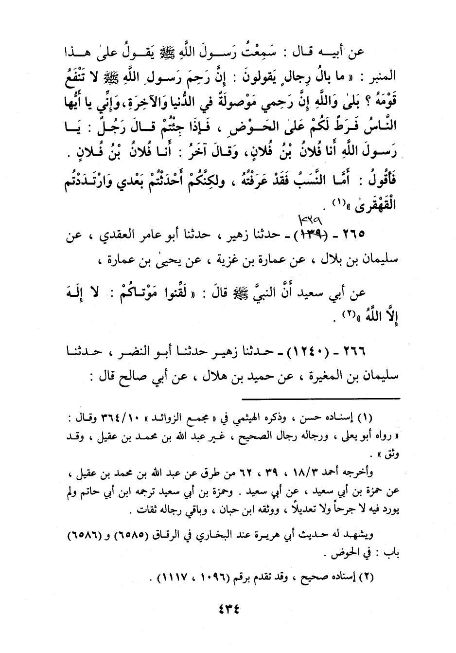 1239 - حَدَّثَنَا زُهَيْرٌ، حَدَّثَنَا أَبُو عَامِرٍ الْعَقَدِيُّ، عَنْ سُلَيْمَانَ بْنِ بِلَالٍ، عَنْ عُمَارَةَ بْنِ غَزِيَّةَ، عَنْ يَحْيَى بْنِ عُمَارَةَ، عَنْ أَبِي سَعِيدٍ، أَنَّ النَّبِيَّ صَلَّى اللهُ عَلَيْهِ وَسَلَّمَ قَالَ: " §لَقِّنُوا مَوْتَاكُمْ: لَا إِلَهَ إِلَّا اللَّهُ "Kإسناده صحيح