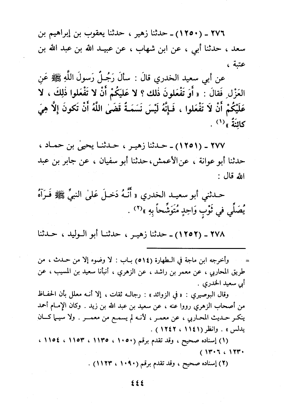 1250 - حَدَّثَنَا زُهَيْرٌ، حَدَّثَنَا يَعْقُوبُ بْنُ إِبْرَاهِيمَ بْنِ سَعْدٍ، حَدَّثَنَا أَبِي، عَنِ ابْنِ شِهَابٍ، عَنْ عُبَيْدِ اللَّهِ بْنِ عَبْدِ اللَّهِ بْنِ عُتْبَةَ، عَنْ أَبِي سَعِيدٍ الْخُدْرِيِّ قَالَ: سَأَلَ رَجُلٌ رَسُولَ اللَّهِ صَلَّى اللهُ عَلَيْهِ وَسَلَّمَ عَنِ الْعَزْلِ، فَقَالَ: «§أَوَتَفْعَلُونَ ذَلِكَ؟ لَا عَلَيْكُمْ أَنْ لَا تَفْعَلُوا ذَلِكَ، لَا عَلَيْكُمْ أَنْ لَا تَفْعَلُوا، فَإِنَّهُ لَيْسَ نَسَمَةٌ قَضَى اللَّهُ أَنْ تَكُونَ إِلَّا هِيَ كَائِنَةٌ» Kإسناده صحيح