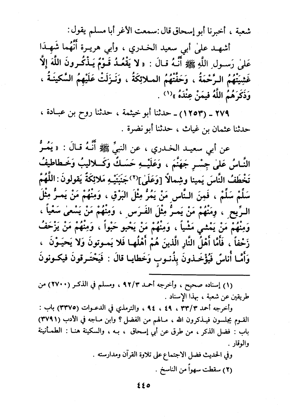 1253 - حَدَّثَنَا أَبُو خَيْثَمَةَ، حَدَّثَنَا رَوْحُ بْنُ عِبَادَةَ، حَدَّثَنَا عُثْمَانُ بْنُ غِيَاثٍ، حَدَّثَنَا أَبُو نَضْرَةَ، عَنْ أَبِي سَعِيدٍ الْخُدْرِيِّ، عَنِ النَّبِيِّ صَلَّى اللهُ عَلَيْهِ وَسَلَّمَ أَنَّهُ قَالَ: " §يَمُرُّ النَّاسُ عَلَى جَسْرِ جَهَنَّمَ، وَعَلَيْهِ حَسَكٌ وَكَلَالِيبُ وَخَطَاطِيفُ تَخْطَفُ النَّاسَ يَمِينًا وَشِمَالًا، وَعَلَى جَنْبَتَيْهِ مَلَائِكَةٌ يَقُولُونَ: اللَّهُمَّ سَلِّمْ سَلِّمْ، فَمِنَ النَّاسِ مَنْ يَمُرُّ مِثْلَ الْبَرْقِ، وَمِنْهُمْ مَنْ يَمُرُّ مِثْلَ الرِّيحِ، وَمِنْهُمْ مَنْ يَمُرُّ مِثْلَ الْفَرَسِ، وَمِنْهُمْ مَنْ يَسْعَى سَعْيًا، وَمِنْهُمْ مَنْ يَمْشِي مَشْيًا، وَمِنْهُمْ مَنْ يَحْبُوا حَبْوًا، وَمِنْهُمْ مَنْ يَزْحَفُ زَحْفًا، فَأَمَّا أَهْلُ النَّارِ الَّذِينَ هُمْ أَهْلُهَا فَلَا يَمُوتُونَ وَلَا يَحْيَوْنَ، وَأَمَّا أُنَاسٌ فَيُؤْخَذُونَ بِذَنُوبٍ وَخَطَايَا، قَالَ: فَيَحْتَرِقُونَ فَيَكُونُونَ -[446]- فَحْمًا، ثُمَّ يُؤْذَنُ فِي الشَّفَاعَةِ، فَيُؤْخَذُونَ ضِبَارَاتٍ ضِبَارَاتٍ، فَيُقْذَفُونَ عَلَى نَهَرٍ مِنْ أَنْهَارِ الْجَنَّةِ، فَيَنْبُتُونَ كَمَا تَنْبُتُ الْحِبَّةُ فِي حَمِيلِ السَّيْلِ "، قَالَ رَسُولُ اللَّهِ صَلَّى اللهُ عَلَيْهِ وَسَلَّمَ: " أَمَا رَأَيْتُمُ الصَّبْغَاءَ شَجَرَةً تَنْبُتُ فِي الْغُثَاءِ؟ فَيَكُونُ مِنْ آخِرِ مَنْ أُخْرِجَ مِنَ النَّارِ رَجُلٌ عَلَى شَفَتِهَا، فَيَقُولُ: يَا رَبِّ اصْرِفْ وَجْهِي عَنْهَا، فَيَقُولُ: عَهْدَكَ وَذِمَّتَكَ لَا تَسْأَلُنِي غَيْرَهَا؟ قَالَ: وَعَلَى الصِّرَاطِ ثَلَاثُ شَجَرَاتٍ فَيَقُولُ: يَا رَبِّ حَوِّلْنِي إِلَى هَذِهِ الشَّجَرَةِ آكُلُ مِنْ ثَمَرِهَا، وَأَكُونُ فِي ظِلِّهَا، فَيَقُولُ: عَهْدَكَ وَذِمَّتَكَ لَا تَسْأَلُنِي غَيْرَهَا؟ قَالَ: يَرَى أُخْرَى أَحْسَنَ مِنْهَا فَيَقُولُ: يَا رَبِّ حَوِّلْنِي إِلَى هَذِهِ آكُلُ مِنْ ثَمَرِهَا وَأَكُونُ فِي ظِلِّهَا، قَالَ: فَيَقُولُ عَهْدَكَ وَذِمَّتَكَ لَا تَسْأَلُنِي غَيْرَهَا؟ قَالَ: ثُمَّ يَرَى أُخْرَى فَيَقُولُ: يَا رَبِّ حَوِّلْنِي إِلَى هَذِهِ آكُلُ مِنْ ثَمَرِهَا وَأَشْرَبُ فِي ظِلِّهَا، ثُمَّ يَرَى سَوَادَ النَّاسِ وَيَسْمَعُ كَلَامَهُمْ، قَالَ: فَيَقُولُ: يَا رَبِّ أَدْخِلْنِي الْجَنَّةَ "، قَالَ أَبُو نَضْرَةَ: اخْتَلَفَ أَبُو سَعِيدٍ وَرَجُلٌ مِنْ أَصْحَابِ النَّبِيِّ صَلَّى اللهُ عَلَيْهِ وَسَلَّمَ، فَقَالَ أَحَدُهُمَا: «فَيُدْخِلُهُ الْجَنَّةَ، فَيُعْطَى الدُّنْيَا وَمِثْلَهَا» وَقَالَ الْآخَرُ: «يَدْخُلُ الْجَنَّةَ فَيُعْطَى الدُّنْيَا وَعَشَرَةَ أَمْثَالِهَا» Kإسناده صحيح