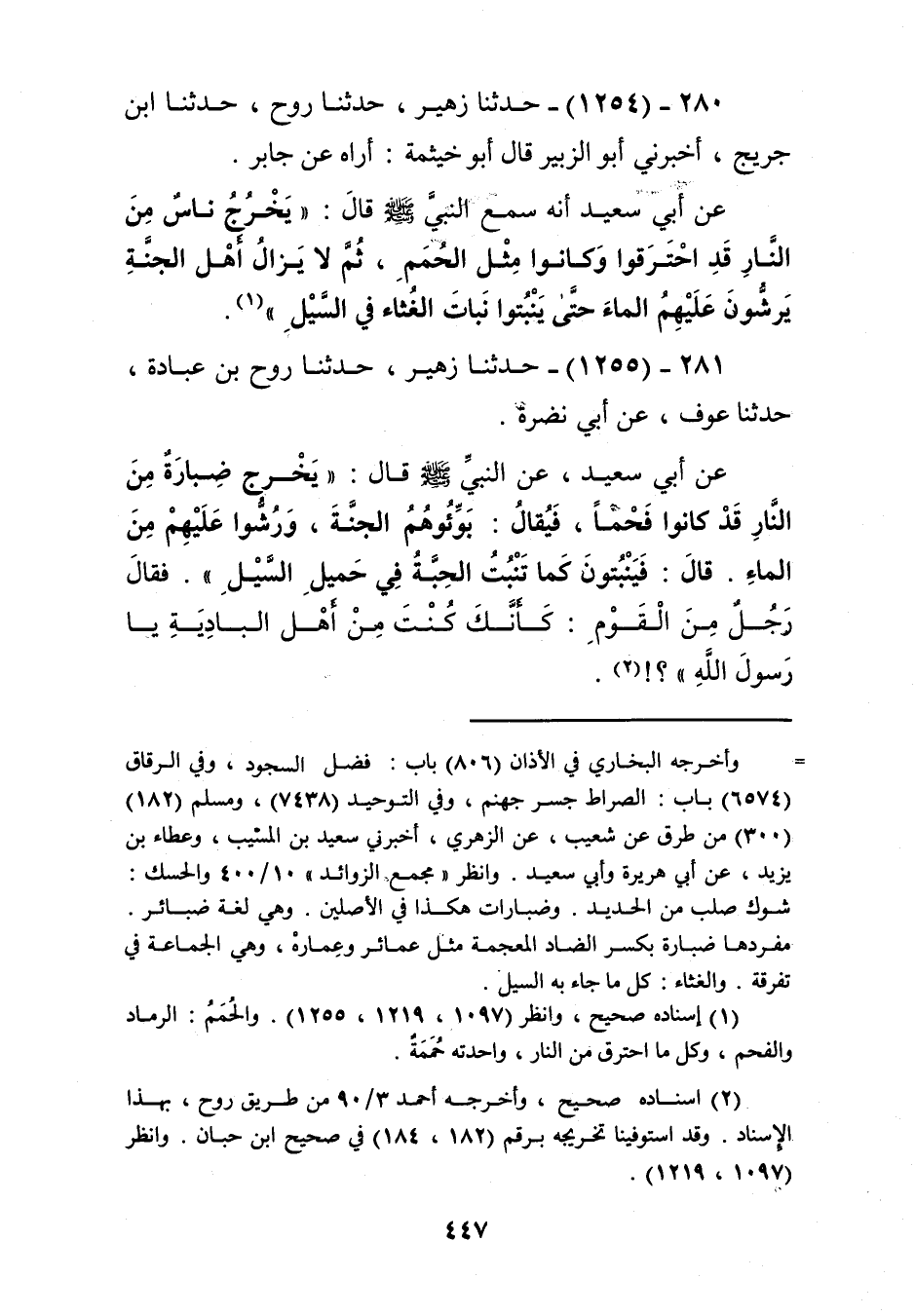 1254 - حَدَّثَنَا زُهَيْرٌ، حَدَّثَنَا رَوْحٌ، حَدَّثَنَا ابْنُ جُرَيْجٍ، أَخْبَرَنِي أَبُو الزُّبَيْرِ، قَالَ أَبُو خَيْثَمَةَ: أَرَاهُ عَنْ جَابِرٍ، عَنْ أَبِي سَعِيدٍ، أَنَّهُ سَمِعَ النَّبِيَّ صَلَّى اللهُ عَلَيْهِ وَسَلَّمَ قَالَ: «§يَخْرُجُ نَاسٌ مِنَ النَّارِ قَدِ احْتَرَقُوا وَكَانُوا مِثْلَ الْحُمَمِ، ثُمَّ لَا يَزَالُ أَهْلُ الْجَنَّةِ يَرُشُّونَ عَلَيْهِمُ الْمَاءَ حَتَّى يَنْبُتُوا نَبَاتَ الْغُثَاءِ فِي السَّيْلِ» Kإسناده صحيح