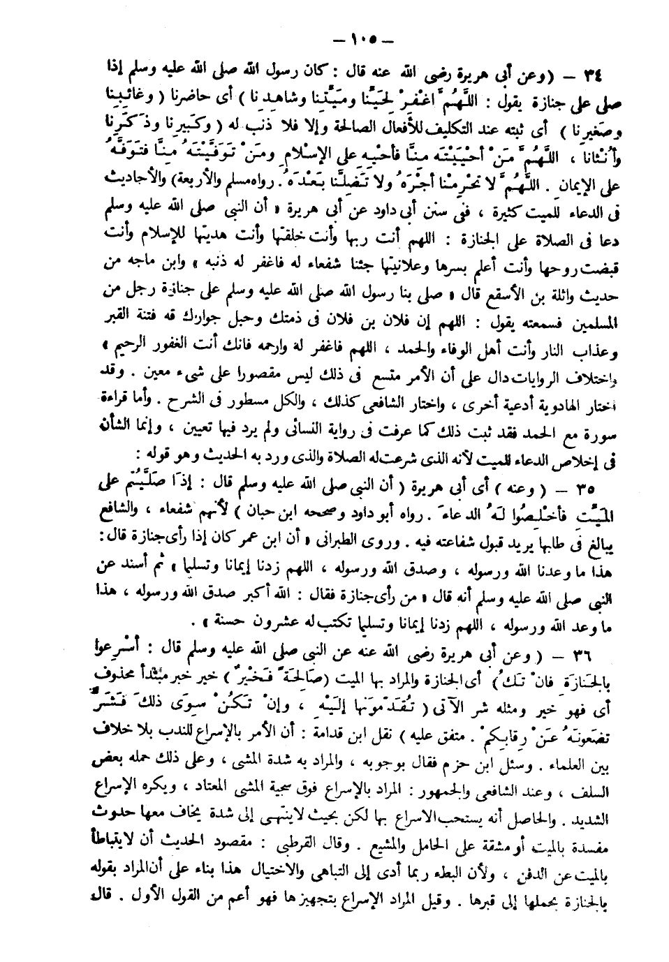 36- ( وعن أبي هريرة رضي الله عنه عن النبي صَلّى الله عَلَيْهِ وَسَلّم قال: "أسرعوا بالجنازة فإن تكُ ) أي الجنازة والمراد بها الميت "صالحة فخيْرٌ " خيْرٌ خبر مبتدأ محذوف أي فهو خير ومثله شر الآتي "تُقدِّمُونها إليْه، وإن تكُن سوى ذلك فشرٌّ تضعونه عنْ رقابكم " متفق عليه".
