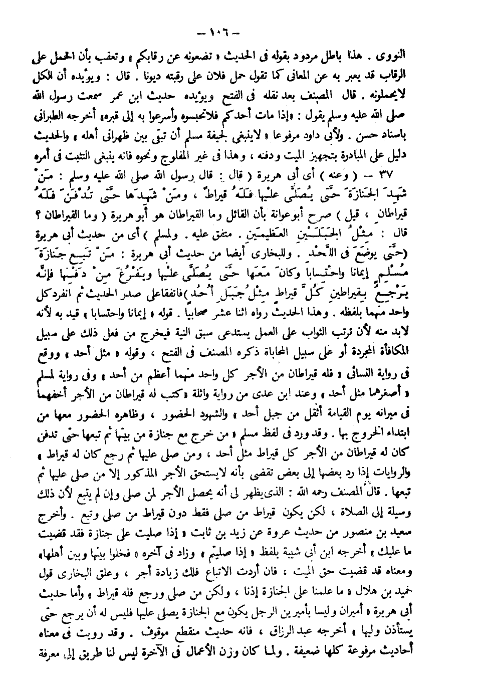 37- ( (وعنه) أي أبي هريرة (قال: قال رسول الله صَلّى الله عَلَيْهِ وَسَلّم: "من شهد الجنازة حتى يصلى عليها فلهُ قيراطٌ ومن شهدها حتى تدفن فله قيراطان" قيل: صرح أبو عوانة بأن القائل وما القيراطان هو أبي هريرة (وما القيراطان؟ قال: مثل الجبلين العظيمين" متفق عليه. ولمسلم) أي من حديث أبي هريرة حتى يوضع في اللحد". وللبخاري أيضاً من حديث أبي هريرة "من تبع جنازة مسلم إيماناً واحتساباً وكان معها حتى يصلى عليها ويفرغ من دفنها فإنه يرجع بقيراطين كل قيراطٍ مثلُ جبل أُحُدٍ" فاتفقا على صدر الحديث ثم انفرد كل واحد منهما بلفظ. وهذا الحديث رواه اثنا عشر صحابياً.
