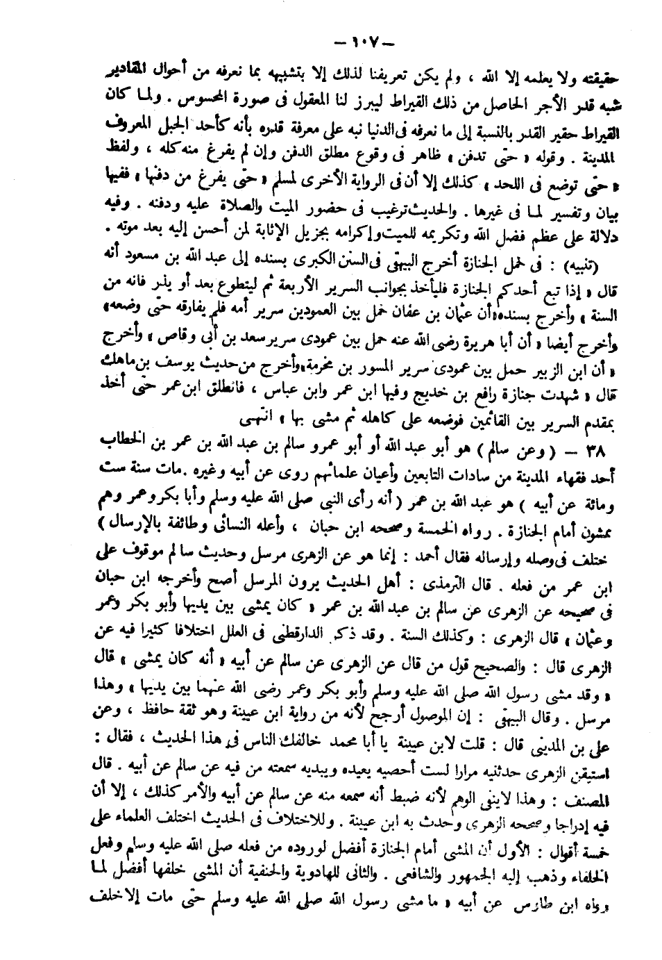 38- (وعن سالم رضي الله عنه) هو أبو عبد الله أووأبو عمرو: سالم بن عبد الله بن عمر بن الخطاب أحد فقهاء المدينة من سادات التابعين وأعيان علمائهم روى عن أبيه وغيره مات سنة ست ومائة (عن أبيه) هو عبد الله بن عمر ( أنه رأى النبي صلى الله عليه وسلم وأبا بكر وعمر وهم يمشون أمام الجنازة . رواه الخمسة وصححه ابن حبان وأعله النسائي وطائفه بالإرسال) اختلف في وصله وإرساله فقال أحمد: إنما هو عن الزهري مرسل، وحديث سالم موقوف على ابن عمر من فعله. قال الترمذي: أهل الحديث يرون المرسل أصح. وأخرجه ابن حبان في صحيحه عن الزهري عن سالم بن عبد الله بن عمر كان يمشي بين يديها وأبو بكر وعمر وعثمان. قال الزهري: وكذلك السنة. وقد ذكر الدارقطني في العلل اختلافاً كثيراً فيه عن الزهري قال: والصحيح قول من قال عن الزهري عن سالم عن أبيه: أنه كان يمشي. قال: وقد مشى رسول الله صَلّى الله عَلَيْهِ وَسَلّم وأبو بكر وعمر رضي الله عنهما بين يديها. وهذا مرسل وقال البيهقي: إن الموصول أرجح لأنه من رواية ابن عيينة وهو ثقة حافظ، وعن علي بن المديني قال: قلت لابن عيينة: يا أبا محمد خالفك الناس في هذا الحديث، فقال: استيقن؛ الزهري حدثنيه مراراً لست أحصيه، يعيده ويبديه، سمعته من فيه، عن سالم عن أبيه. قال المصنف: وهذا لا ينفي عنه الوهم لأنه ضبط أنه سمعه منه عن سالم عن أبيه والأمر كذلك إلا أن فيه إدراجاً. وصححه الزهري وحدث به ابن عيينة.