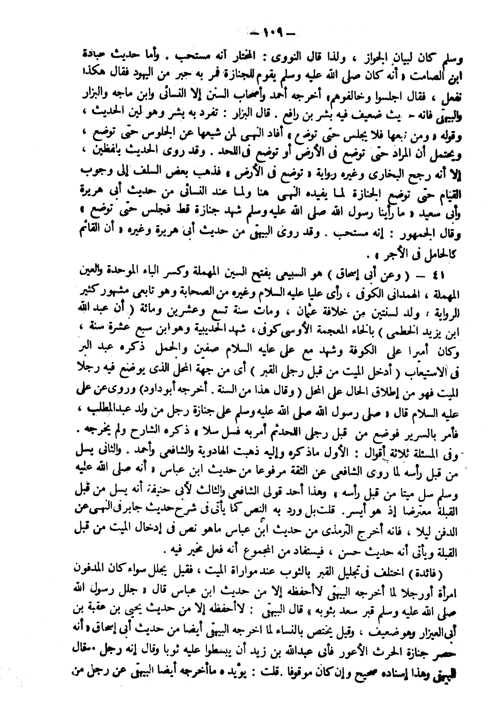 وسلم كان لبيان الجواز، ولذا قال النووي: المختار أنه مستحب. وأما حديث عبادة بن الصامت أنه كان صَلّى الله عَلَيْهِ وَسَلّم يقوم للجنازة فمرّ به حبر من اليهود فقال: هكذا نفعل، فقال: "اجلسوا وخالفوهم" . أخرجه أحمد وأصحاب السنن إلا النسائي وأخرجه البزار والبيهقي، فإنه حديث ضعيف فيه بشر بن رافع قال البزار: تفرّد به بشر وهو لين الحديث.