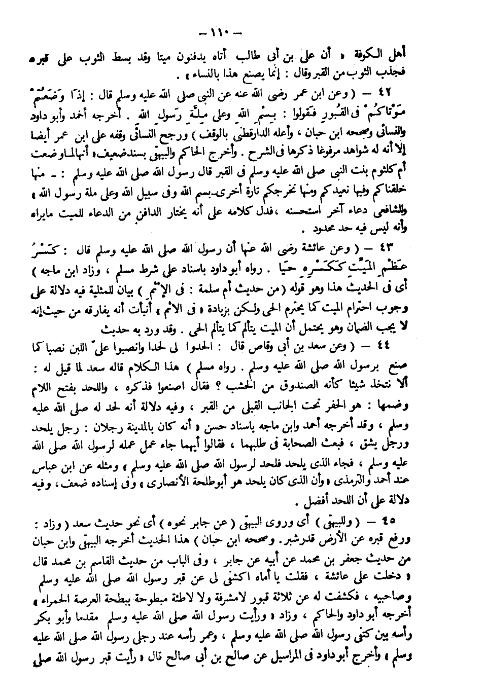 44 – (وعن سعد بن أَبي وقّاص قال: "الْحِدوا لي لَحْداً وانْصِبُوا عليَّ اللّبِنَ نصْباً كما صُنع برسُول الله صَلّى الله عَلَيْهِ وَسَلّم" رواهُ مُسْلم)ٌ. هذا الكلام قاله سعد لما قيل له ألا نتخذ شيئاً كأنه الصندوق من الخشب؟ فقال: اصنعوا. فذكره. واللحد بفتح اللام وضمها هو الحفر تحت الجانب القبلي من القبر.، وفيه دلالة أنه لحد له صَلّى الله عَلَيْهِ وَسَلّم وقد أخرجه أحمد وابن ماجه بإسناد حسن. أنه كان بالمدينة رجلان: رجل يلحد ورجل يشق فبعث الصحابة في طلبهما فقالوا: أيهما جاء عمل عمله لرسول الله صلى الله عليه وآله وسلم فجاء الذي يلحد فلحد لرسول الله صَلّى الله عَلَيْهِ وَسَلّم". ومثله عن ابن عباس عند أحمد والترمذي. وأن الذي كان يلحد هو أبو طلحة الأنصاري: وفي إسناده ضعف. وفيه الدلالة على أن اللحد أفضل..