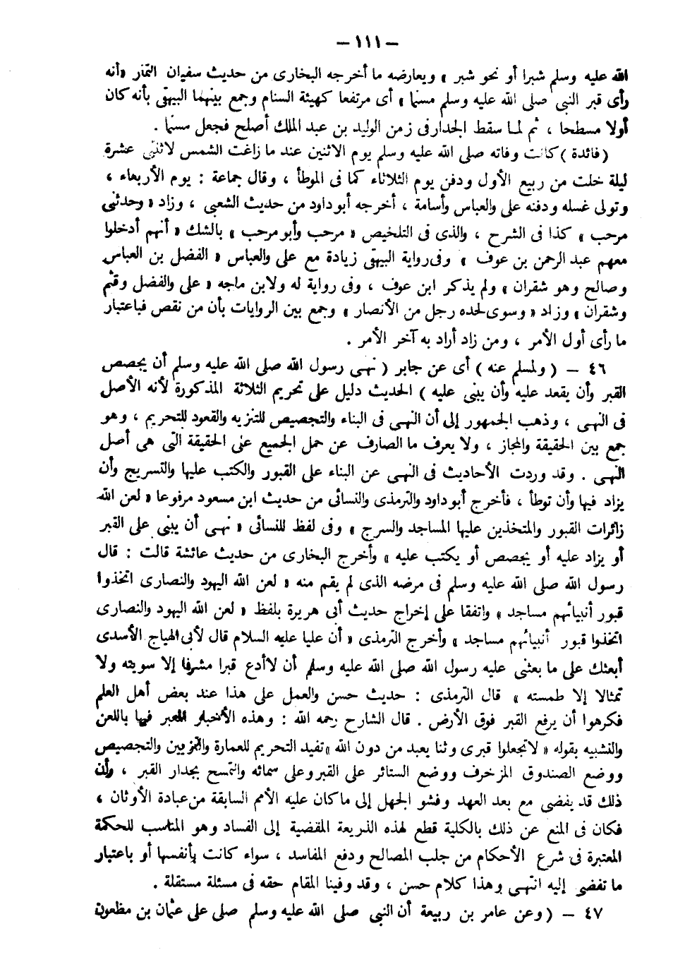 46- (ولمسلم عنه) أي عن جابر "نهى رسول الله صَلّى الله عَلَيْهِ وَسَلّم أن يجصص القبر وأن يقعد عليه وأن يبنى عليه" الحديث دليل على تحريم الثلاثة المذكورة لأنه الأصل في النهي. وذهب الجمهور إلى أن النهي في البناء والتجصيص للتنزيه. والقعود للتحريم وهو جمع بين الحقيقة والمجاز ولا يعرف ما الصارف عن حمل الجميع على الحقيقة التي هي أصل النهي. وقد وردت الأحاديث في النهي عن البناء على القبور والكتب عليها والتسريج وأن يزاد فيها وأن توطأ. فأخرج أبو داود والترمذي والنسائي من حديث ابن مسعود مرفوعاً: "لعن الله زائرات القبور والمتخذين عليها المساجد والسرج". وفي لفظ للنسائي: "نهى أن يبنى على القبر أو يزاد عليه أو يجصص أو يكتب عليه" . وأخرج البخاري من حديث عائشة قالت: قال رسول الله صَلّى الله عَلَيْهِ وَسَلّم في مرضه الذي لم يقم منه: "لعن الله اليهود والنصارى اتخذوا قبور أنبيائهم مساجد". واتفقا على إخراج حديث أبي هريرة بلفظ "لعن الله اليهود والنصارى اتخذوا قبور أنبيائهم مساجد" . وأخرج الترمذي "أن علياً عليه السلام قال لأبي الهياج الأسدي: أبعثك على ما بعثني عليه رسول الله صَلّى الله عَلَيْهِ وَسَلّم أن لا أدع قبراً مشرفاً إلا سوّيتهُ ولا تمثالاً إلا طمسته "قال الترمذي: حديث حسن، والعمل على هذا عند بعض أهل العلم، فكرهوا أن يرفع القبر فوق الأرض. قال الشارح رحمه الله: وهذه الأخبار المعبر فيها باللعن والتشبيه بقوله: "لا تجعلوا قبري وثناً يعبد من دون الله" تفيد التحريم للعمارة والتزيين والتجصيص ووضع الصندوق المزخرف ووضع الستائر على القبر وعلى سمائه والتمسح بجدار القبر وأن ذلك قد يفضي مع بعد العهد وفشو الجهل إلى ما كان عليه الأمم السابقة من عبادة الأوثان، فكان في المنع عن ذلك بالكلية قطع لهذه الذريعة المفضية إلى الفساد، وهو المناسب للحكمة المعتبرة في شرع الأحكام من جلب المصالح ودفع المفاسد، سواء كانت بأنفسها أو باعتبار ما تفضي إليه انتهى. وهذا كلام حسن وقد وفينا المقام حقه ومسألة مستقلة.