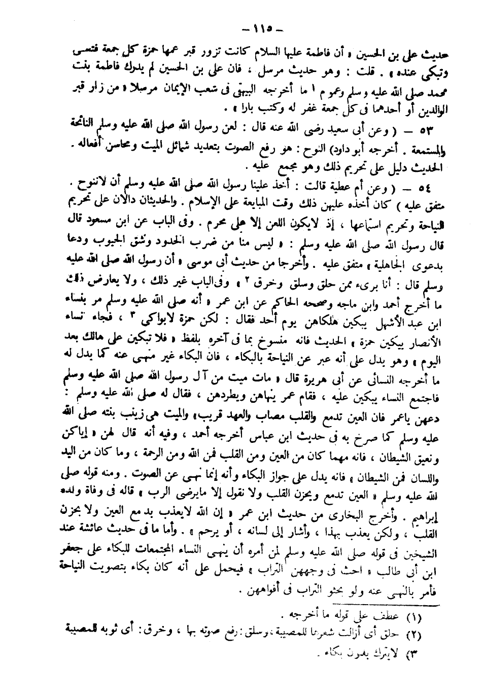 53- وعَنْ أَبي سعيدٍ الخُدْريِّ رضيَ اللَّهُ عنْهُ قالَ: "لَعَن رسولُ الله صَلّى الله عَلَيْهِ وَسَلّم النّائِحَةَ والمُسْتَمِعَةَ" أَخْرَجَهُ أَبُو داود. النوح هو رفع الصوت بتعديد شمائل الميت ومحاسن أفعاله.والحديث دليل على تحريم ذلك وهو مجمع عليه.