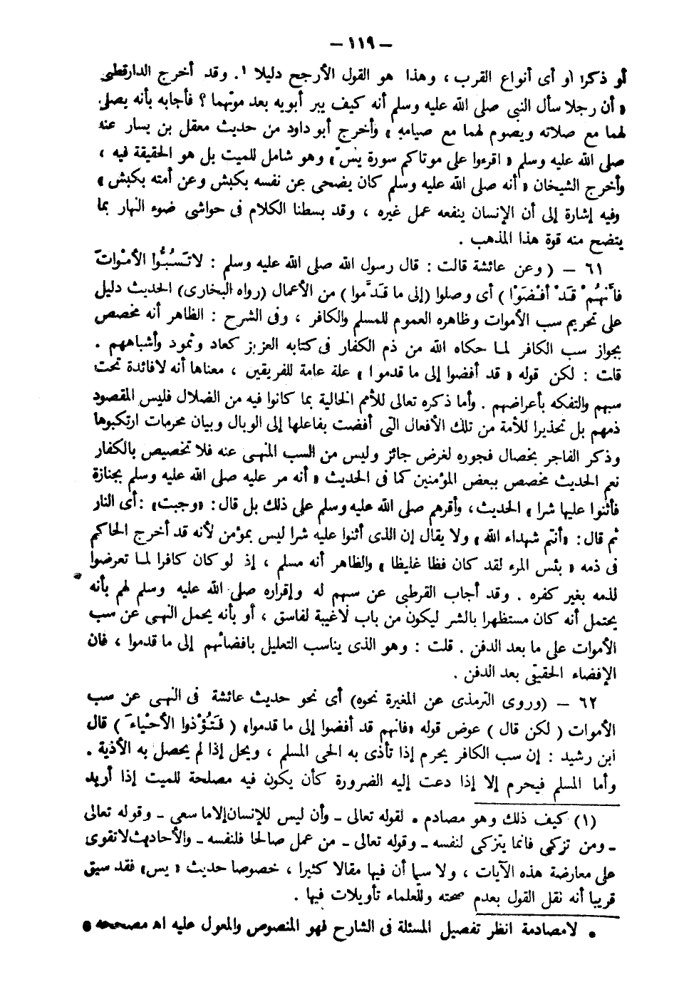 62-) وروي الترمذي عن المغيرة نحوه) أي نحو حديث عائشة في النهي عن سب الأموات (لكن قال) عوض قوله "فإنهم قد أفضوا إلى ما قدموا" ( فتؤذوا الأحياء ) قال ابن رشد: إن سب الكافر يحرم إذا تأذى به الحي المسلم. ويحل إذا لم يحصل به الأذية، وأما المسلم فيحرم إلا إذا دعت إليه الضرورة كأن يكون فيه مصلحة للميت إذا أريد
