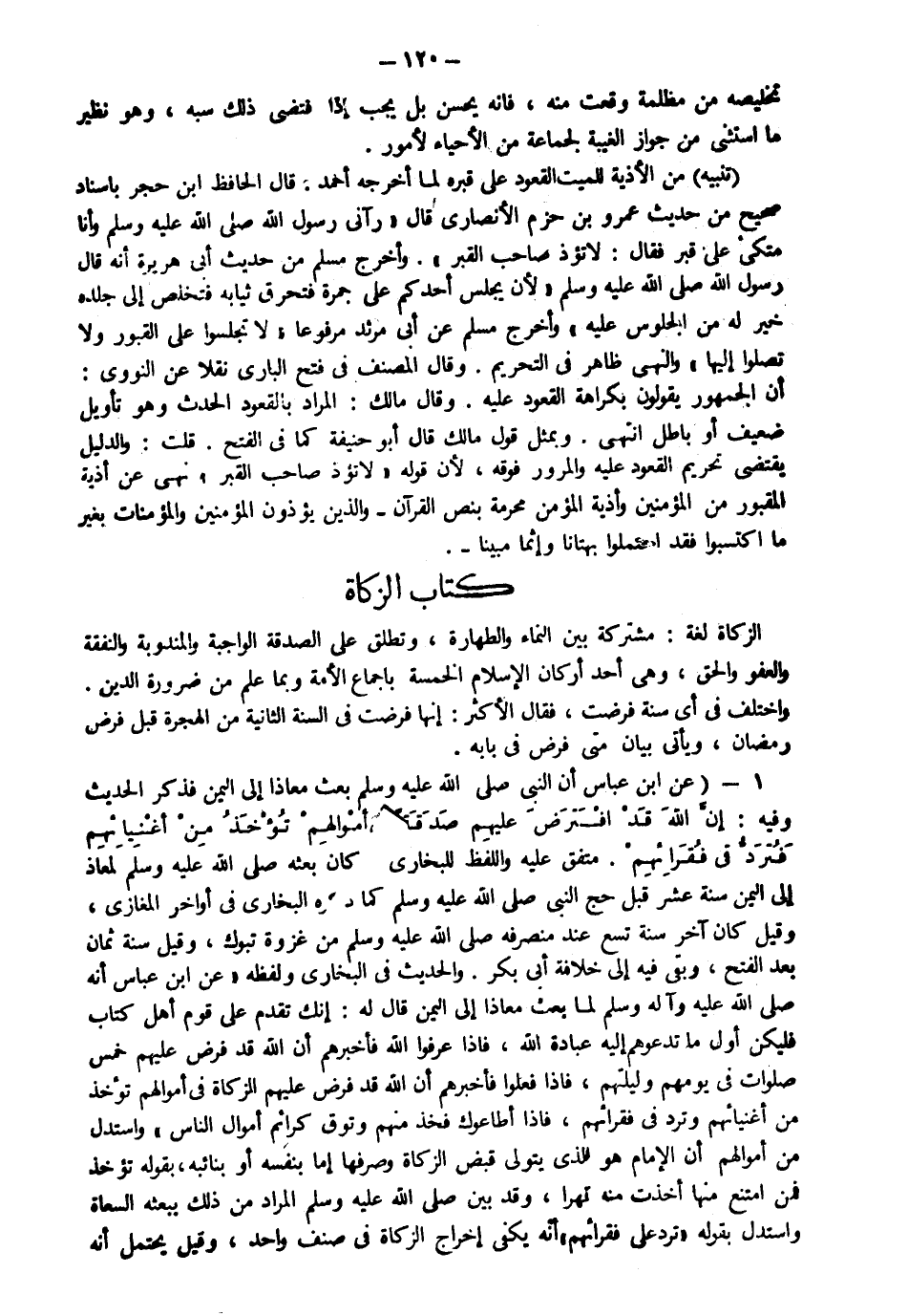 1 - (عن ابن عباس أن النبي صلى الله عليه وسلم بعث معاذا إلى اليمين فذكر الحديث وفيه "إن الله قد افترض عليهم الصدقة في أموالهم تؤخذ من أغنيائهم فترد في فقرائهم" متفق عليه واللفظ للبخاري كان بعثه صلى الله عليه وسلم لمعاذ إلى اليمن سنة عشر قبل حج النبي صلى الله عليه وسلم كما ذكره البخاري في أواخر المغازي وقيل كان آخر سنة تسع عند منصرفه صلى الله عليه وسلم من غزوة تبوك وقيل سنة ثمان بعد الفتح وبقي فيه إلى خلافة أبي بكر والحديث في البخاري ولفظه عن ابن عباس أنه صلى الله عليه وسلم لما بعث معاذا إلى اليمن قال له: "إنك تقدم على قوم أهل كتاب فليكن أول ما تدعوهم إليه عبادة الله فإذا عرفوا الله فأخبرهم أن الله قد فرض عليهم خمس صلوات في يومهم وليلتهم فإذا فعلوا فأخبرهم أن الله قد فرض عليهم الزكاة في أموالهم تؤخذ من أغنيائهم وترد في فقرائهم فإذا أطاعوك فخذ منهم وتوق كرائم أموال الناس" واستدل من أموالهم أن الإمام هو الذي يتولى قبض الزكاة وصرفها إما بنفسه أو بنائبه بقوله تؤخذ فمن امتنع منها أخذت منه قهرا وقد بين صلى الله عليه وسلم المراد من ذلك ببعثه السعادة واستدل بقوله ترد على فقرائهم أنه يكفي إخراج الزكاة في صنف واحد وقيل يحتمل أنه