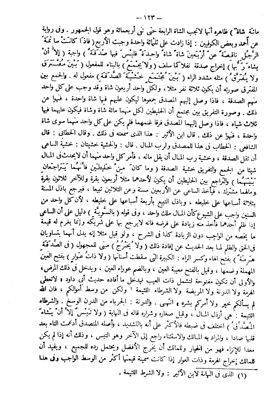مائة شاة" ظاهره أنها لا تجب الشاة الرابعة حتى تفي أربعمائة وهو قول الجمهور وفي رواية عن أحمد وبعض الكوفيين إذا زادت على ثلاثمائة واحدة وجبت الأربع "فإذا كانت سائمة الرجل ناقصة عن أربعين شاة شاة واحدة فليس فيها صدقة" واجبة " إلا أن يشاء ربها" إخراج صدقة نفلا كما سلف "ولا يجمع" بالبناء للمفعول "بين متفرق ولا يفرق" مثله مشدد الراء "بين مجتمع خشية الصدقة" مفعول له والجمع بين المفترق صورته أن يكون ثلاث نفر مثلا ولكل واحد أربعون شاة وقد وجب على كل واحد منهم الصدقة فإذا وصل إليهم المصدق جمعوها ليكون عليهم فيها شاة واحدة فنهوا عن ذلك وصورة التفريق بين مجتمع أن الخليطين لكل منهما مائة شاة وشاة فيكون عليهما فيها ثلاث شياه فإذا وصل إليهما المصدق فرقا غنمهما فلم يكن على كل واحد منهما سوى شاة واحدة فنهو عن ذلك قال ابن الأثير هذا الذي سمعته في ذلك وقال الخطابي قال الشافعي الخطاب في هذا للمصدق ولرب المال قال والخشية خشيتان خشية الساعي أن تقل الصدقة وخشية رب المال أن يقل ماله فأمر كل واحد منهما أن لا يحدث في المال شيئا من الجمع والتفريق خشية الصدقة "وما كان من خليطين فإنهما يتراجعان بينهما" والتراجع بين الخليطين أن يكون لأحدهما مثلا أربعون بقرة وللآخر ثلاثون بقرة ومالهما مشترك فأخذ الساعي عن الأربعين مسنة وعن الثلاثين تبيعا فيرجع باذل المسنة بثلاثة أسباعها على خليطه وباذل التبيع بأربعة أسباعه على خليطه لأن كل واحد من السنين واجب على الشيوع كأن المال ملك واحد وفي قوله "بالسوية" دليل على أن الساعي إذا ظلم أحدهما فأخذ منه زيادة على فرضه فإنه لا يرجع بها على شريكه وإنما يغرم له قيمة ما يخصه من الواجب دون الزيادة كذا في الشرح ولو قيل مثلا إنه يدل أنهما يتساويان في الحق والظلم لما بعد الحديث عن إفادة ذلك "ولا يخرج" مبني للمجهول "في الصدقة هرمة" بفتح الهاء وكسر الراء الكبيرة التي سقطت أسنانها " ولا ذات عوار" بفتح العين المهملة وضمها وقيل بالفتح معيبة العين وبالضم عوراء العين ويدخل في ذلك المرض والأولى أن تكون مفتوحة ليشمل ذات العيب فيدخل ما أفاده حديث أبي داود "ولا تعطي الهرمة ولا الدرنة ولا المريضة ولا الشرطاء اللئيمة ولكن من وسط أموالكم فإن الله لم يسألكم خيره ولا أمركم بشره" انتهى والدرنة الجرباء من الدرن الوسخ والشرطاء اللئيمة هي أرذل المال وقيل صغاره وشراره قاله في النهاية "ولا تيس إلا أن يشاء المصدق" اختلف في ضبطه فالأكثر على أنه بالتشديد وأصله المتصدق أدغمت التاء بعد قلبها صادا والمراد به المالك والاستثناء راجع إلى الآخر وهو التيس وذلك أنه إذا لم يكن معدا للإنزاء فهو من الخيار وللمالك أن يخرج الأفضل ويحتمل رده إلى للجميع ويفيد أن للمالك إخراج الهرمة وذات العوار إذا كانت ثمينة قيمتها أكثر من الوسط الواجب وفي هذا