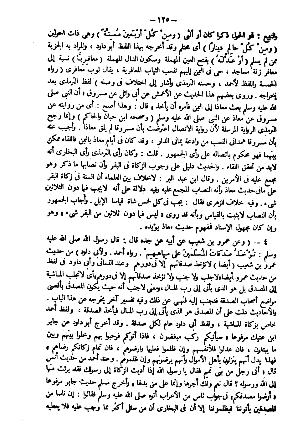 4 - وعن عمرو بن شعيب عن أبيه عن جده قال قال رسول الله صلى الله عليه وسلم: "تؤخذ صدقات المسلمين على مياههم" رواه أحمد ولأبي داود من حديث عمرو بن شعيب أيضا لا تؤخذ صدقاتهم إلا في دورهم وعند النسائي وأبي داود في لفظ من حديث عمرو أيضا "لا جلب ولا جنب ولا تؤخذ صدقاتهم إلا في دورهم" أي لا تجلب الماشية إلى المصدق بل هو الذي يأتي لرب المال ومعنى لا جنب أنه حيث يكون المصدق بأقصى مواضع أصحاب الصدقة فتجنب إليه فنهي عن ذلك وفيه تفسير آخر يخرجه عن هذا الباب والأحاديث دلت على أن المصدق هو الذي يأتي إلى رب المال فيأخذ الصدقة ولفظ أحمد خاص بزكاة الماشية ولفظ أبي داود عام لكل صدقة وقد أخرج أبو داود عن جابر بن عتيك مرفوعا "سيأتيكم ركب مبغضون فإذا أتوكم فرحبوا بهم وخلوا بينهم وبين ما يبتغون فإن عدلوا فلأنفسهم وإن ظلموا فعليها وأرضوهم وإن تمام زكاتكم رضاهم" فهذا يدل أنهم ينزلون بأهل الأموال وأنهم يرضونهم وإن ظلموهم وعند أحمد من حديث أنس قال أتى رجل من بني تميم فقال يا رسول الله إذا أديت الزكاة إلى رسولك فقد برئت منها إلى الله ورسوله قال "نعم ولك أجرها وإنما على من بدلها" وأخرج مسلم حديث جابر مرفوعا أرضوا مصدقكم في جواب ناس من الأعراب أتوه صلى الله عليه وسلم فقالوا إن ناسا من المصدقين يأتوننا فيظلموننا إلا أن في البخاري أن من سئل أكثر مما وجب عليه فلا يعطيه